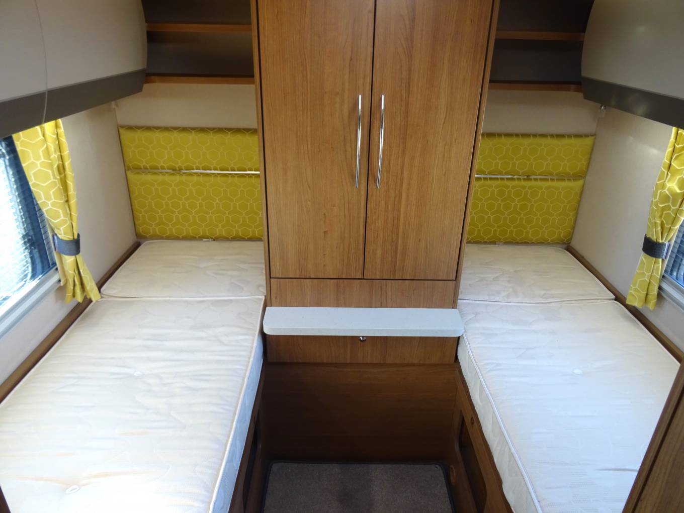 In the bedroom the parallel singles measure 6 ft long and there is a large central wardrobe. There are bed slats for a transverse bed set up, a 2nd TV point and a pull out concertina separator door. Heating and hot water is Truma on gas and electric. There are blinds and fly screens all around including the Hab door. There is both strip and spot lighting.