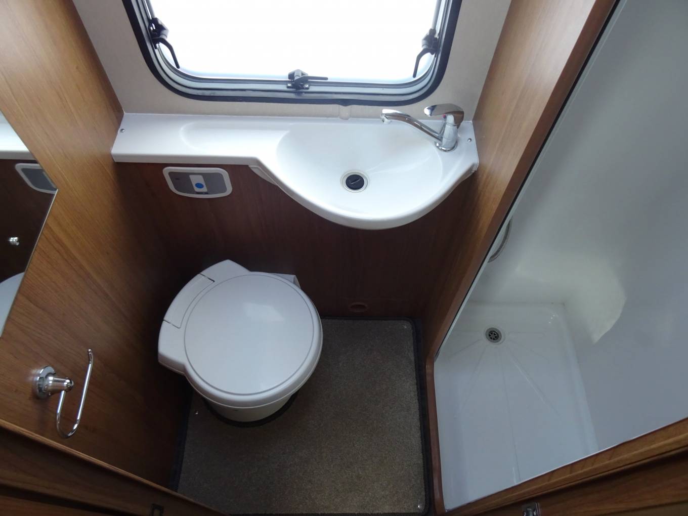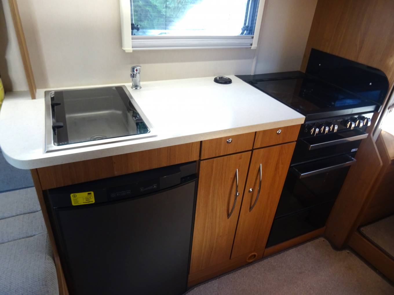 The galley kitchen is excellent with a long counter and large sink. There is a dual fuel hob with large separate Thetford gas oven and grill. The Dometic fridge is 3 way, there is a microwave, plenty of storage, and an overhead 2 way fan. Opposite is the washroom with a toilet, basin, cabinet, and separate shower with solid bi-fold door. This is all a very nice arrangement.