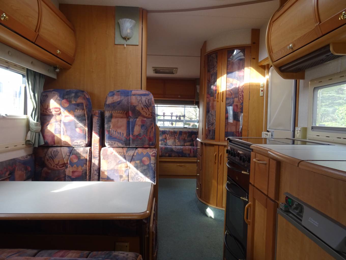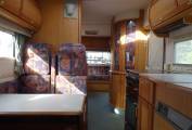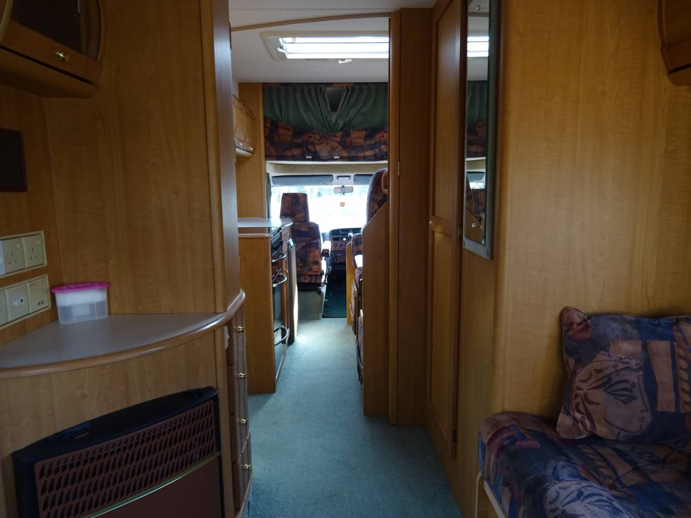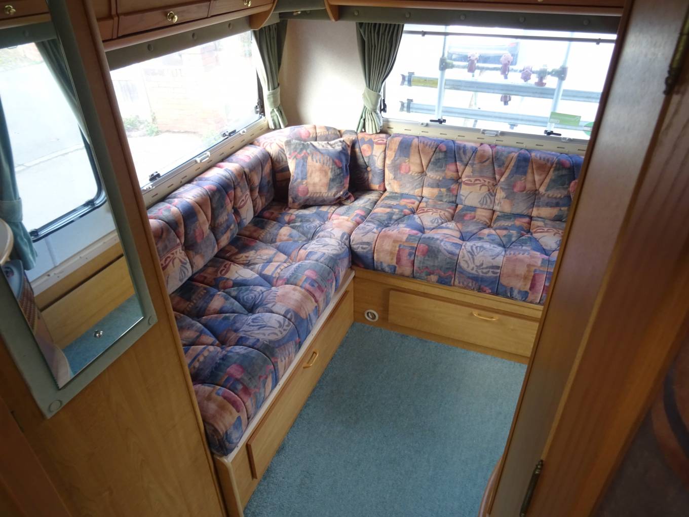 which converts into a double bed. Up front above the cab you have another double bed. Opposite the entrance door is the bathroom with