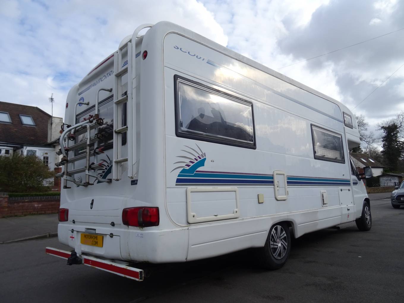 This low milage, Auto-Trail Scout, overhead cab, sleeps six, has four seatbelts, is 7.1m long, has a gross weight of 3850kg and is based on a Fiat Ducato with a 2.8 litre diesel engine. Inside it’s in beautiful condition.