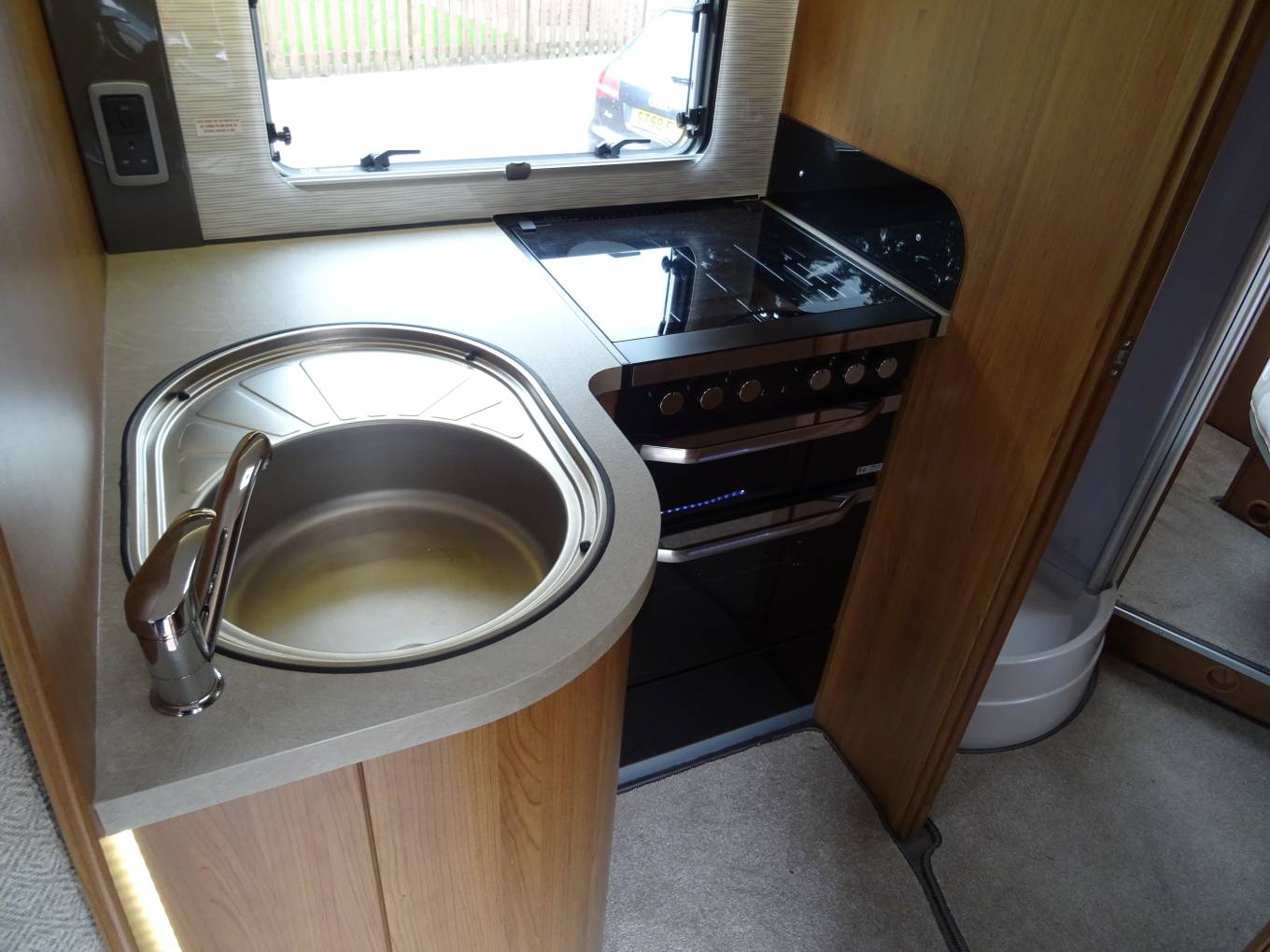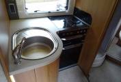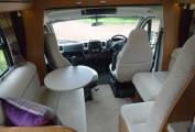 The kitchen area has all you would expect in a vehicle of this quality, with the usual hob, oven and grill, sink with hot water and large fridge with freezer box. The central dinette / lounge is a lovely area to relax and eat dinner, with an occasional table and a larger free standing table if required - this area also makes into another double bed as well as providing another two travel seats.