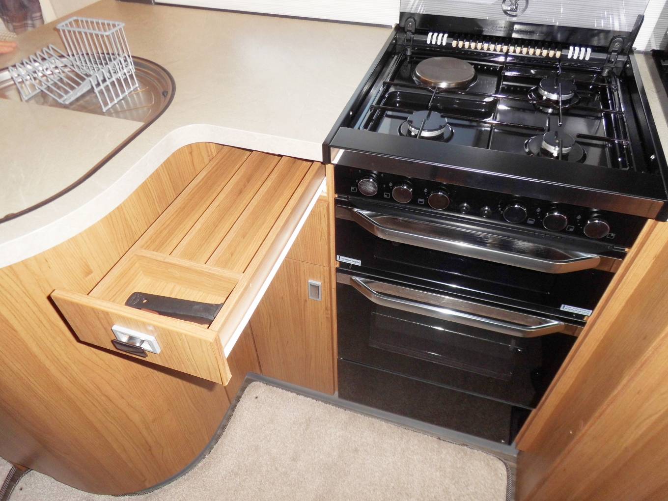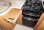 Next up is the well appointed kitchen area and if you like cooking you'll love this motorhome . It's fitted with 3 gas burners and 1 electric, an oven with grill, a microwave, a 3 way fridge freezer, a sink and tap and lots of cupboard space to store your ingredients and utensils.