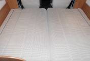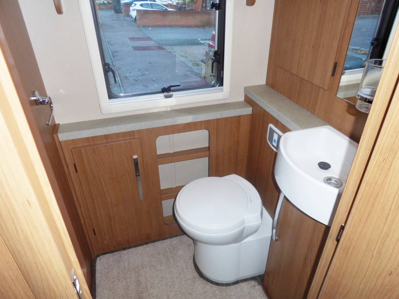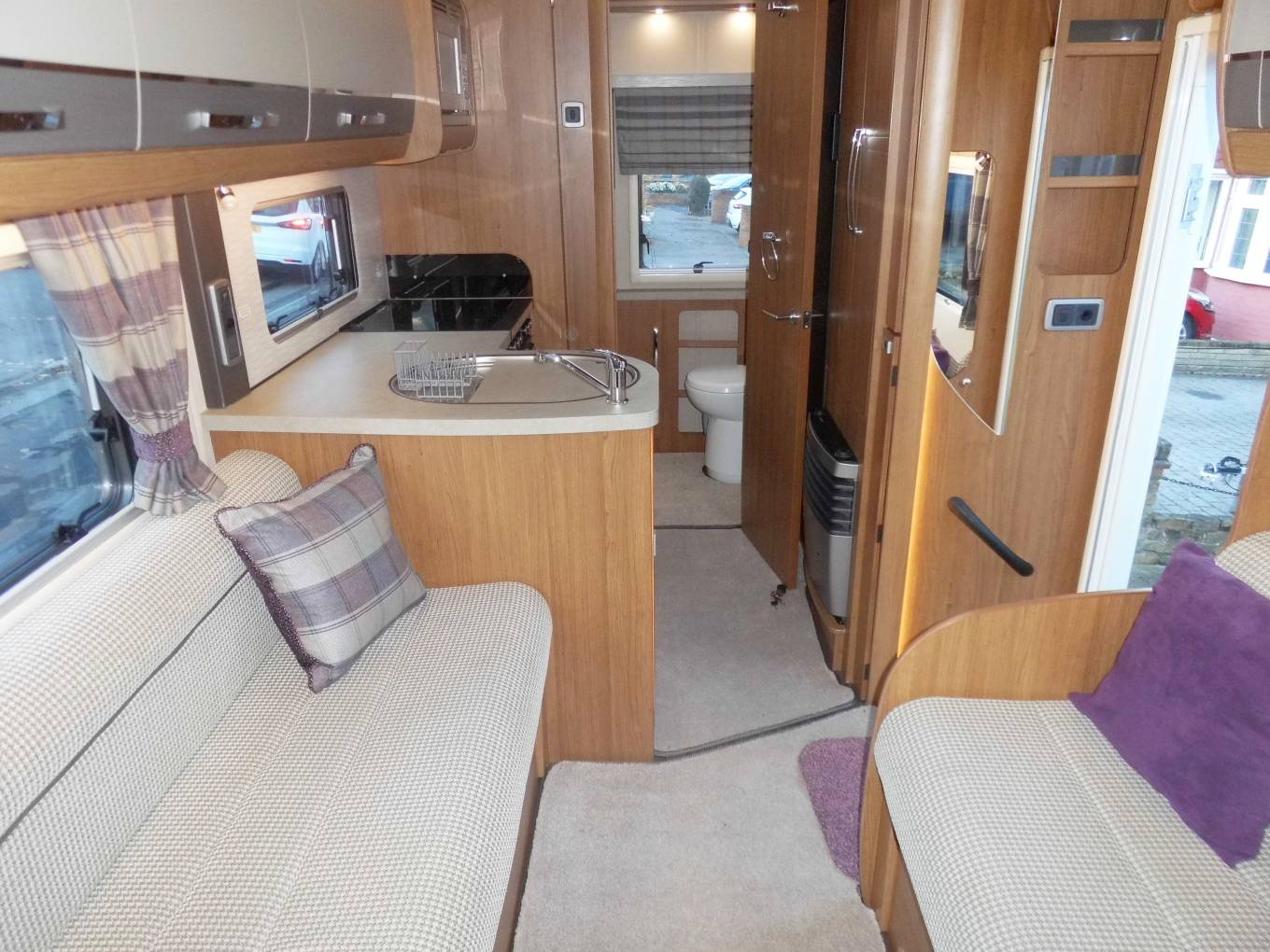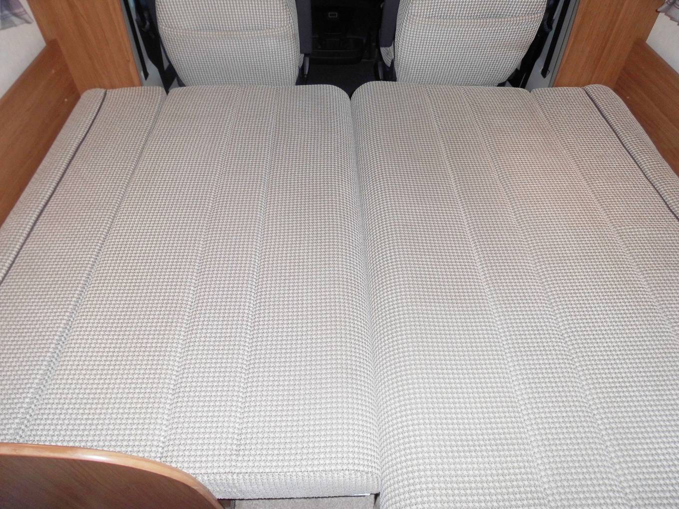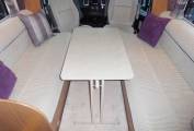 The habitation area is one of the most stylish layouts I have seen. The upholstery is beautifully finished in a lovely light fabric with 2 facing bench seats. Add in the dining table, swivel the 2 front seats round and you have a lovely area to enjoy good times with friends and family. There is a drop down TV fitted above the cab area which conveniently folds away. At night time the 2 sofas make in to a large double bed.