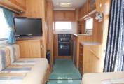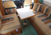 The lounge area comprises of a side facing sofa and on the opposite side a side facing chair. There is a TV on a bracket and the owner has added a self seeking satellite dish so you can enjoy all your favourite shows. When it's time to eat, pop up the freestanding dining table, open the large skylight above and you have a lovely area to relax in and enjoy mealtimes. At night the seats convert into a comfortable double bed. Above there are plenty of storage lockers as well as additional storage space under the chairs.