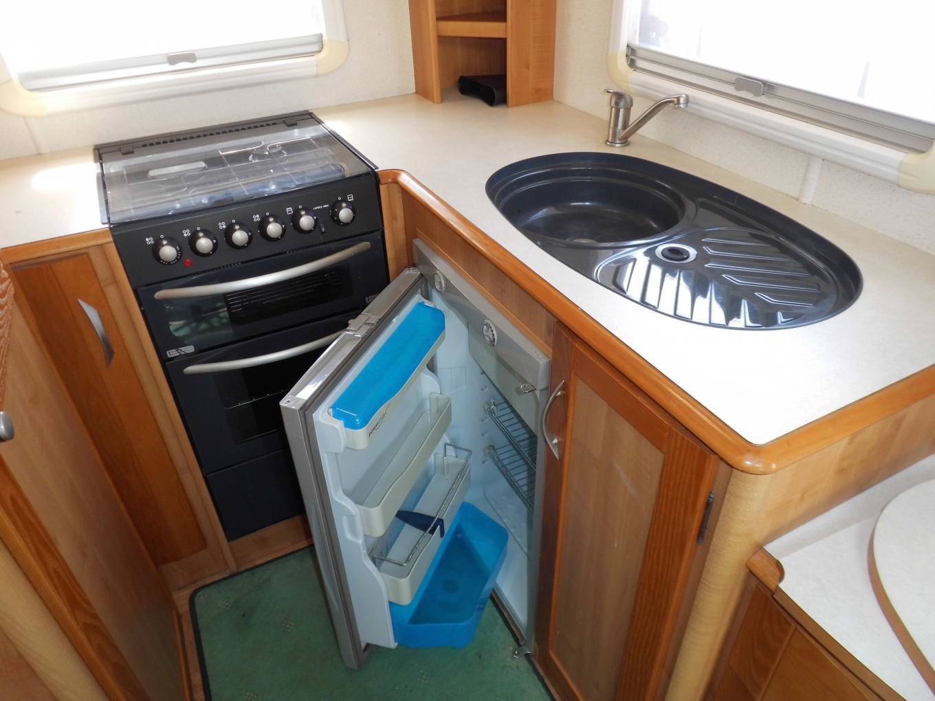 Inside, the motorhome has the popular end kitchen layout. The kitchen comprises of a gas oven and grill, a 3 gas burner hob and an electric hotplate, a 3 way fridge with ice box, a sink with mixer tap and plenty of storage space for your utensils and ingredients. Next to the kitchen is the washroom which has a shower, a cassette toilet, a washbasin with mixer tap, a mirror and a storage unit so you have everything you need to keep yourself feeling fresh and clean.