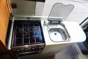 and oven beneath. There is a 3-way powered Dometic fridge with ice-box, upper