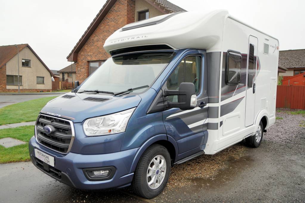 For sale we have this blue, 2020 Tribute F60, 4-berth, 4-seatbelts, compact motorhome that is just 5.99m long. Based on the Ford 2.0ltr, Euro6, 170BHP engine with automatic gearbox, alloy wheels, reversing camera, sat-nav ready, Bluetooth, and DAB radio.