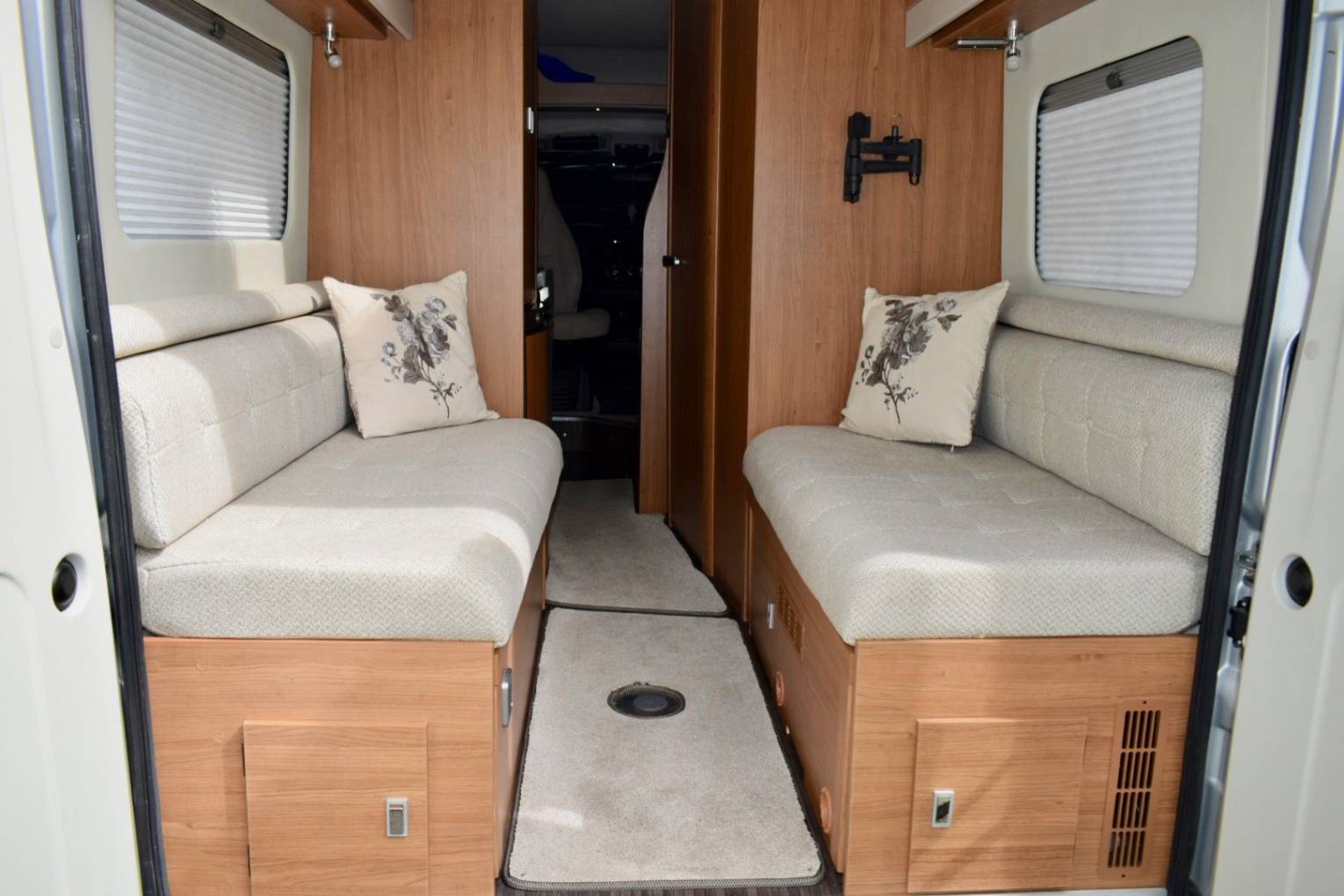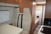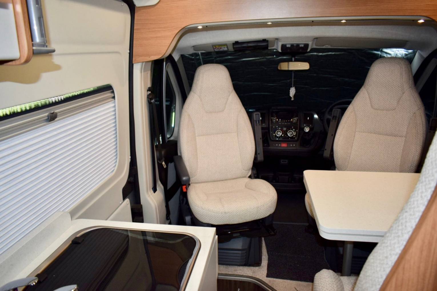On entering via the large sliding side door to your left are the two swivelling cab seats with some roof storage above and in front of you two forward facing belted seats with a side attached extendable table forming a half dinette.