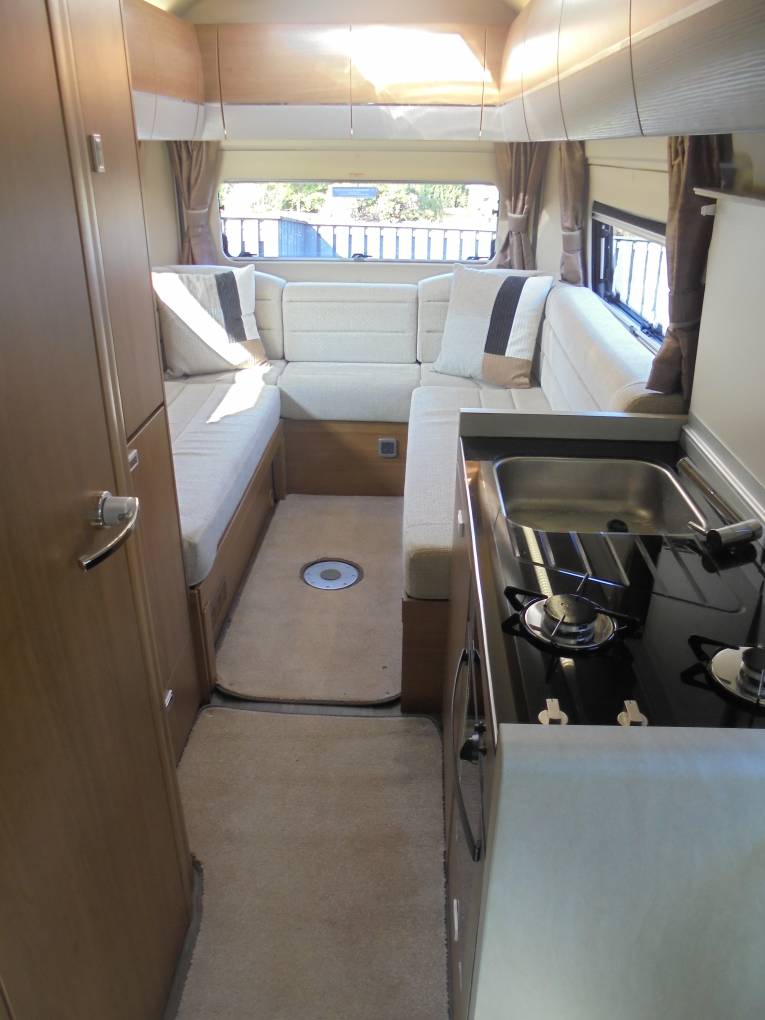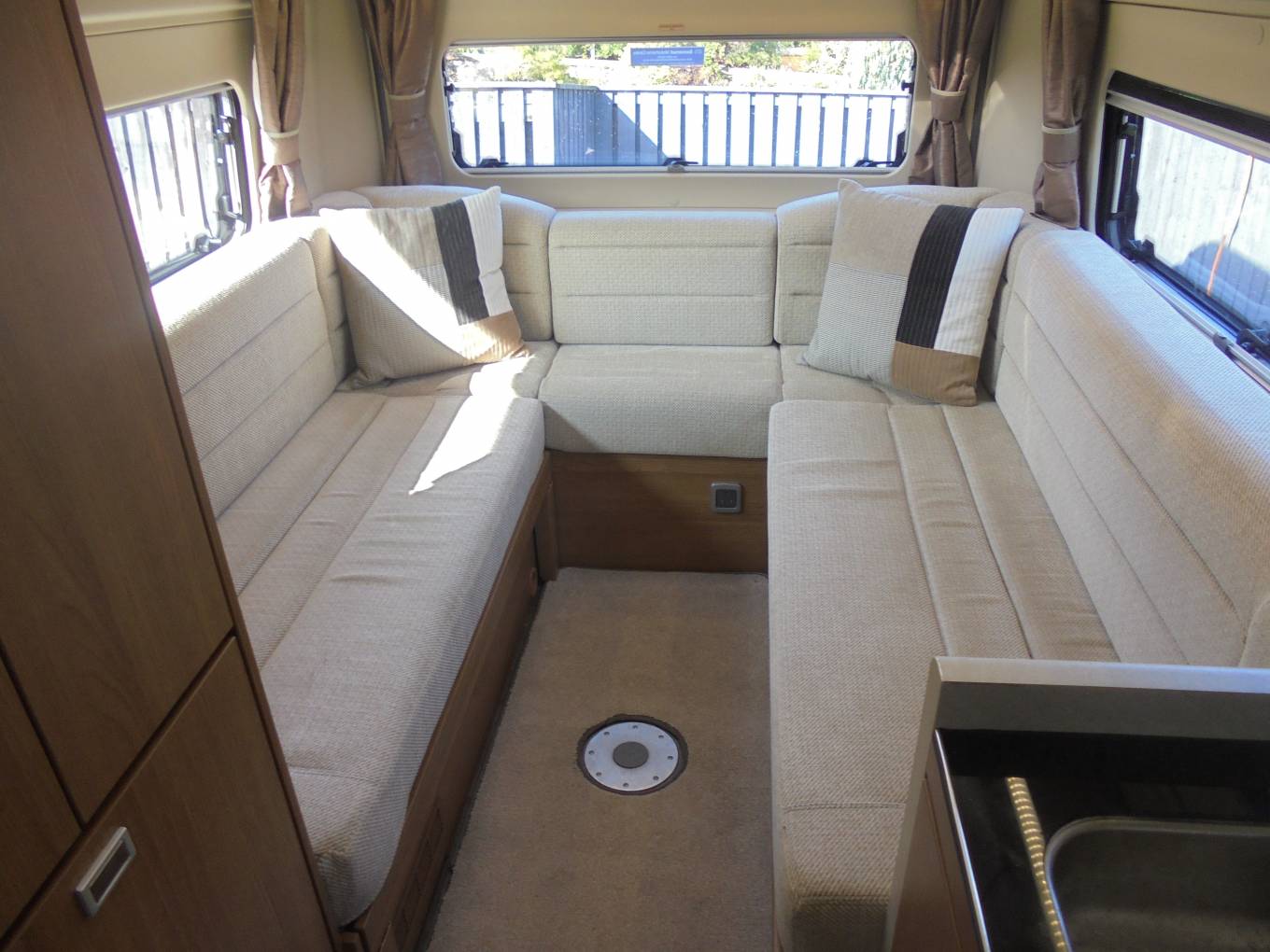 U-shaped end lounge, which easily converts at night into a large double bed or can be used as two single beds this area has full round panoramic windows and has a fitted TV/DVD player with
