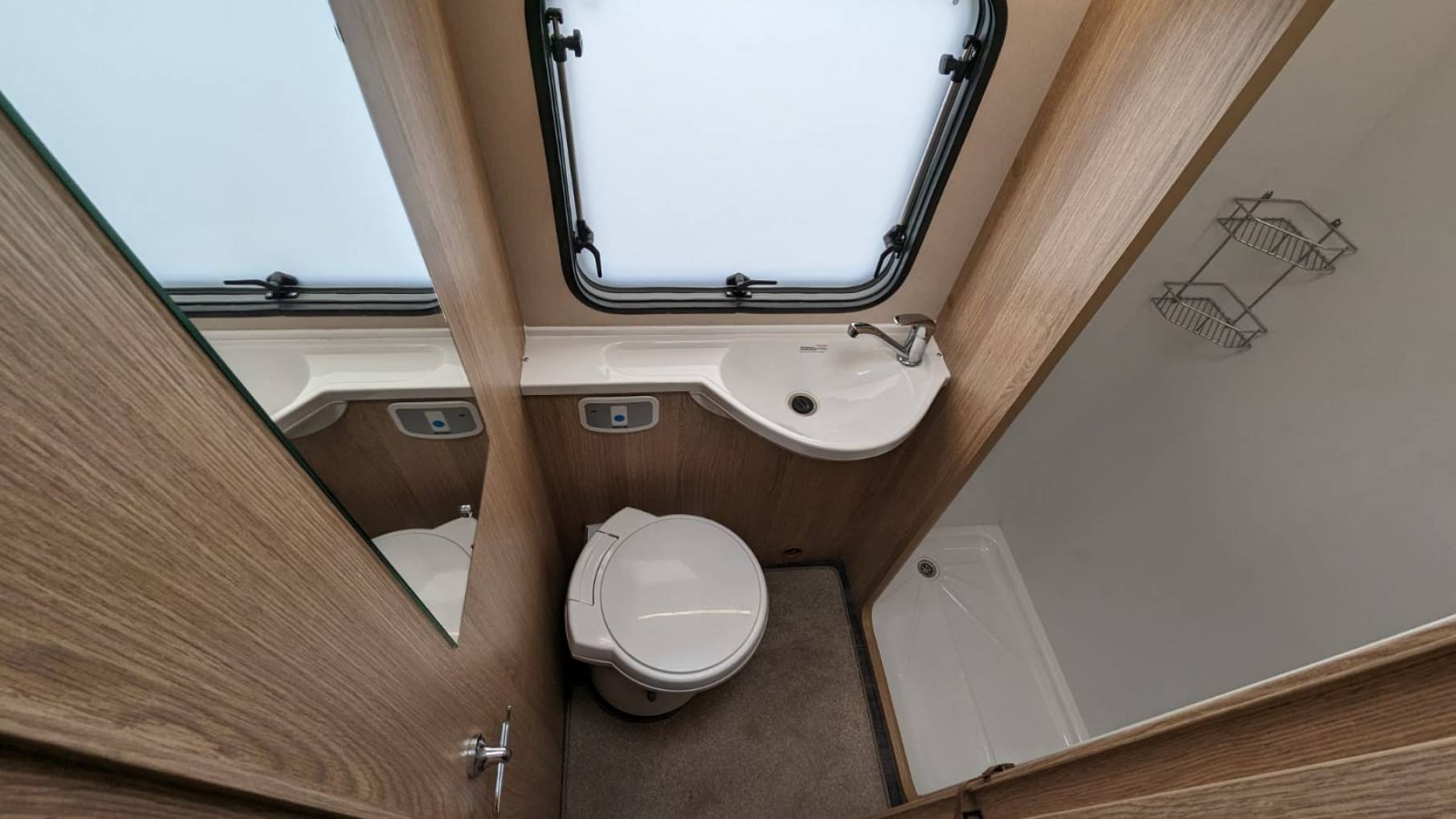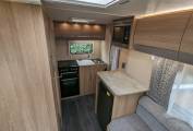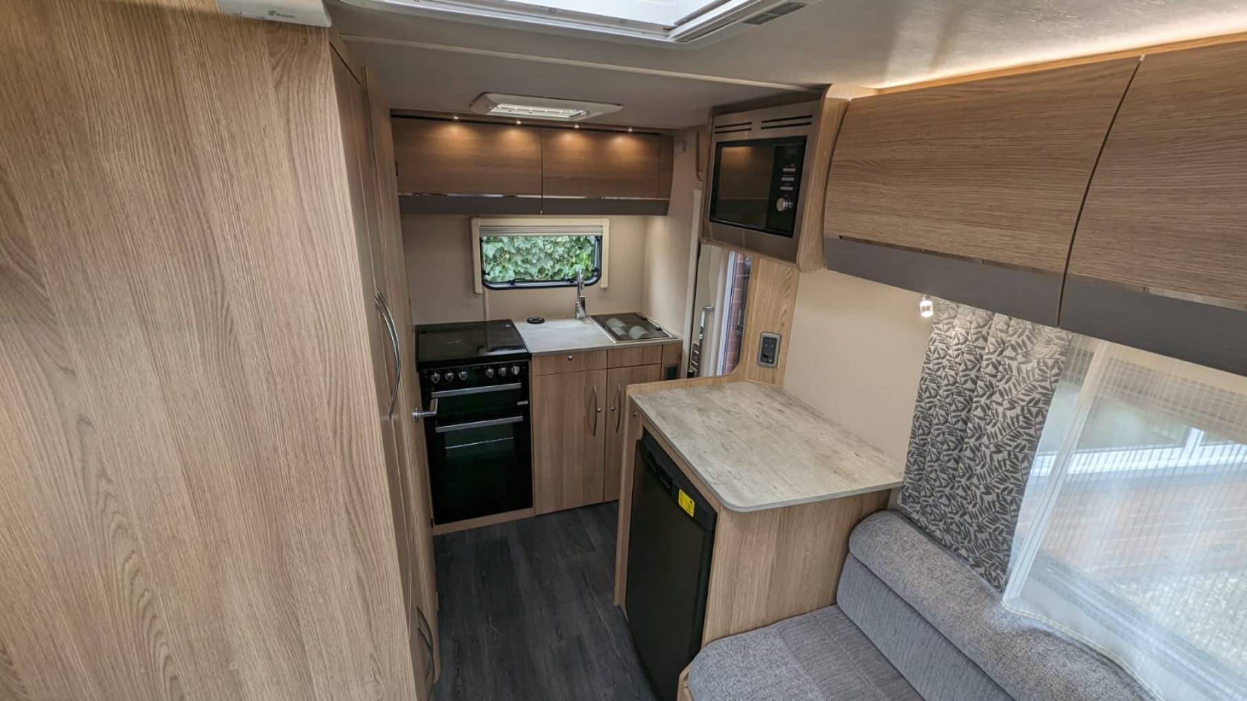 The end kitchen area is equally impressive, featuring a 3-way fridge freezer, gas hob, microwave, and sink with a mixer tap, perfect for preparing meals on-the-go. The washroom is fully equipped with a shower, sink, and cassette toilet.