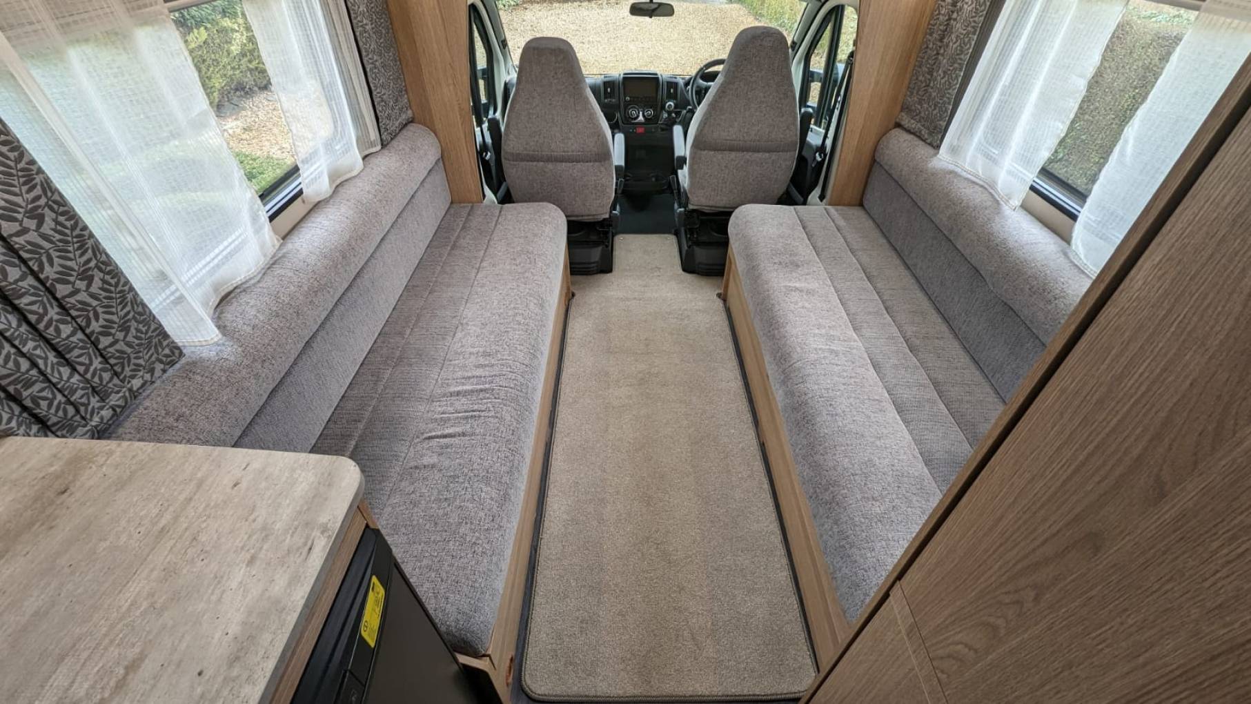 The cab of the motorhome is loaded with premium features, including cruise control, air conditioning, built-in blinds, reverse camera, Bluetooth, and DAB radio. Both seats can be swivelled to the centre to create a spacious dining and relaxing area that effortlessly transforms into a large double bed, complete with plenty of storage space above.