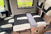 With full lap and diagonal seat belts 4 people can travel safely and comfortably and in the evening the end lounge easily makes into a good sized double or indeed can be left as fixed bed when travelling.