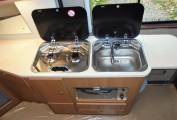 The kitchen has 2x gas burner, gas grill, sink, 12v Waeco fridge with freezer compartment and additional foldaway worktop space. The washroom has cassette toilet, fold down sink and shower. Hot water and heating is available on gas or electric. The campervan is fitted with swivel seats, electric step, blinds throughout, electric hook up, split charge system to charge the leisure battery whilst driving, 230v power points and has ample storage in cupboards and under the double bed. The vehicle is also fitted with a large roof rack and ladder, twin bike rack and comes with a TV DVD unit, an inflatable Kampa awning, chairs and a table.