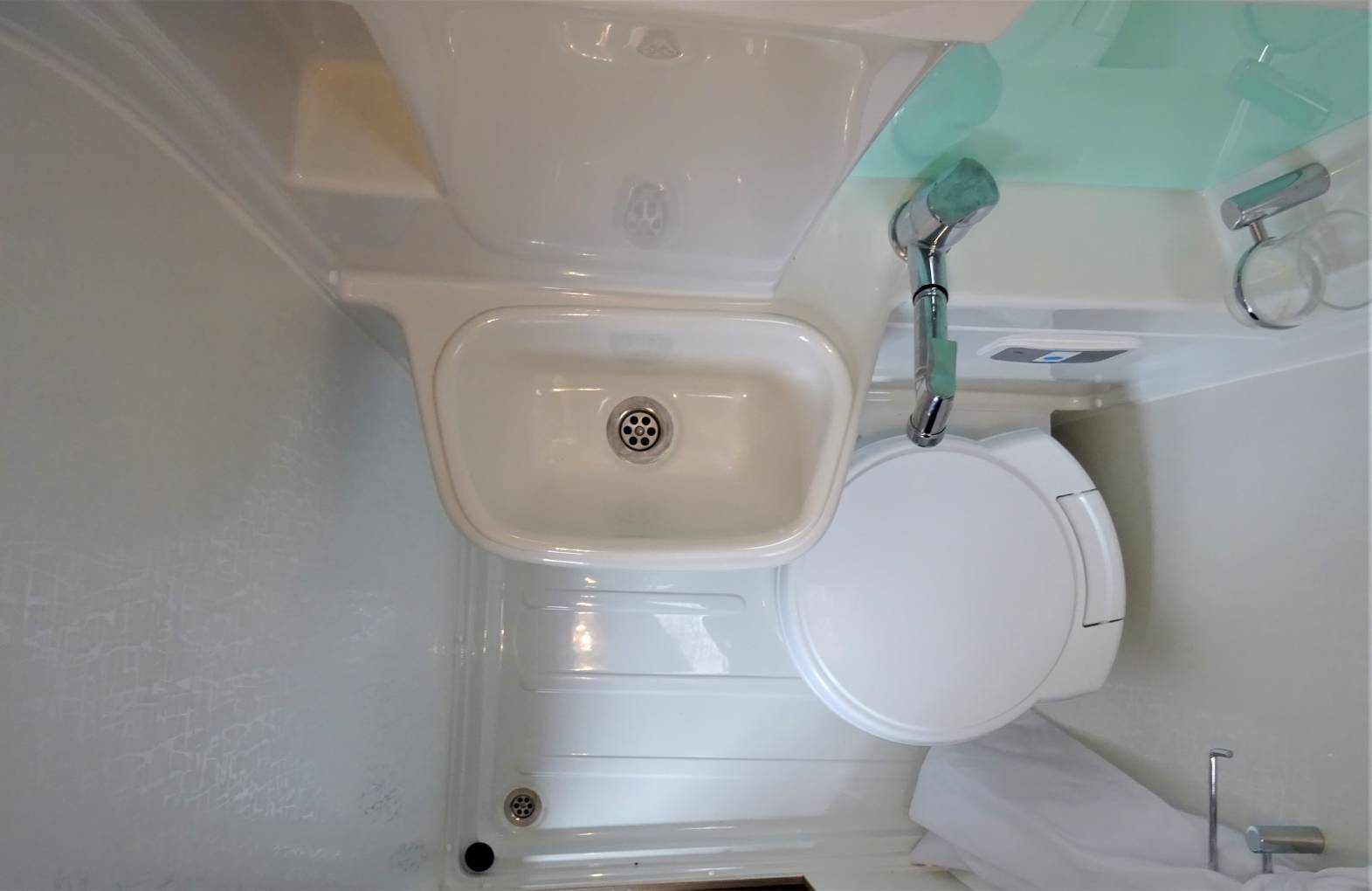 The midships kitchen is well equipped with three way fridge, two burner hob, grill and microwave oven, drawer and locker storage. There is still a good range of worktop and table space, having a kitchen extension panel and swivel table extension and adjacent to the kitchen is the immaculate washroom with shower, toilet and sink with extendable mixer tap.