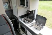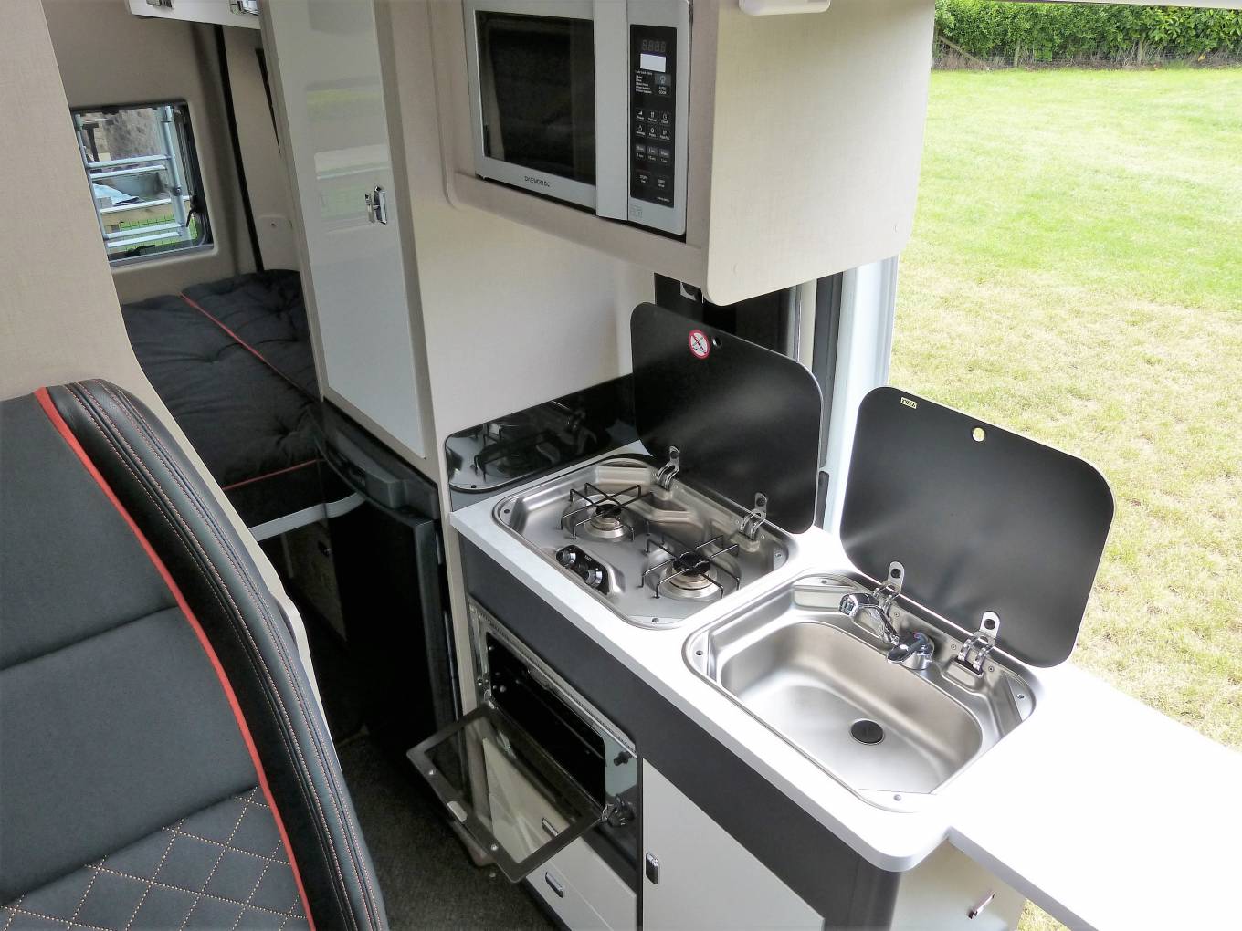 sink, two-burner hob, SMEV grill, Dometic fridge/freezer combo and a microwave.