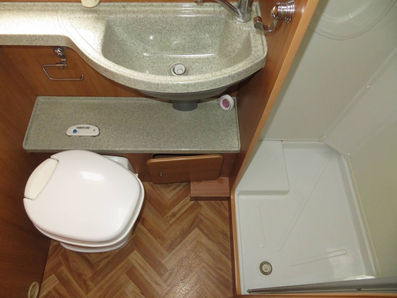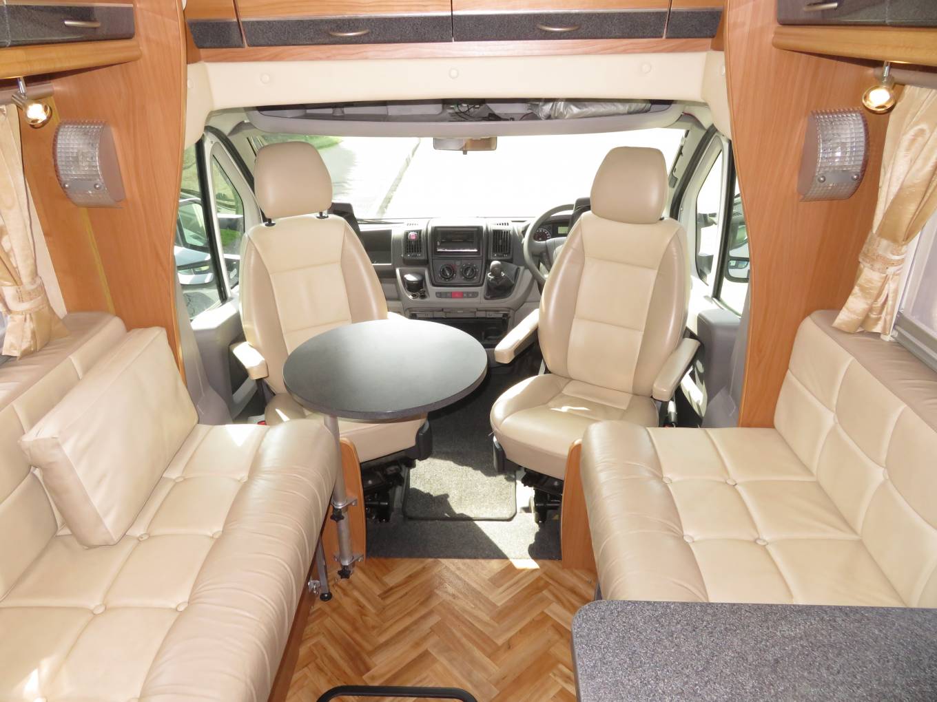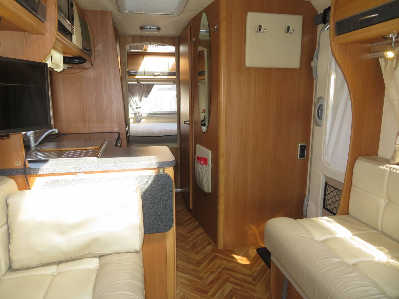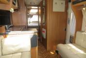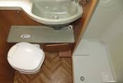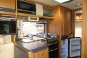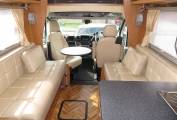 The Starblazer is an extremely comfortable motorhome to sleep in with a fixed transverse bed at the rear and the double sofas at the front making up a further double. The transverse bed is ideal for people over 6 ft as it runs the width of the motorhome. It has a good sized washroom with flush cassette toilet, sink and separate shower. The motorhome has loads of storage and cupboard space and has heating and hotwater via the Truma combi system.