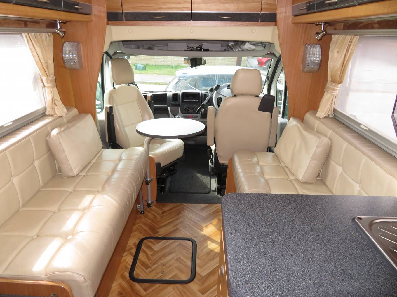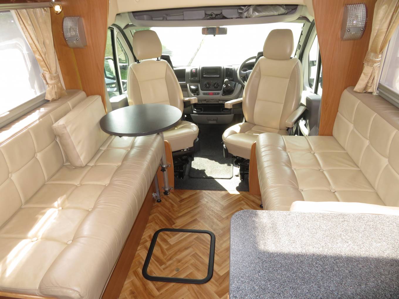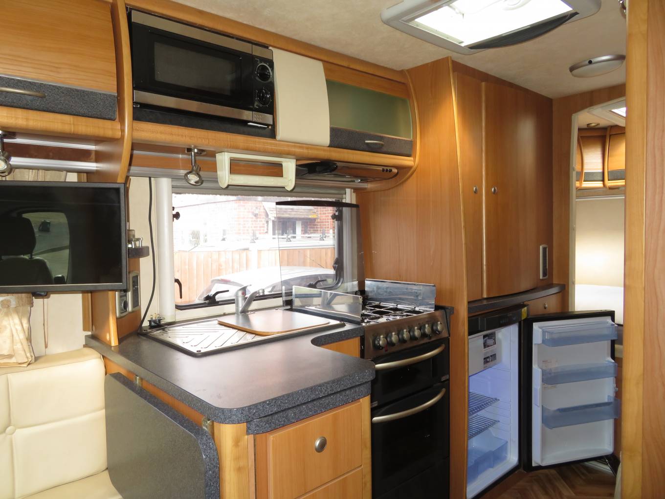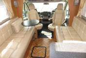The Autocruise is built on a Peugeot chassis with a poweful 3 litre engine and 6 speed manual gearbox. It comes with cab air conditioning and a wifi reversing camera. The layout inside is ideal for a couple - at the front you have a spacious lounge area comprising of two side sofas and the two front captains chairs. There is a small coffee table and even has a further larger self standing table stored in the cupboard. Moving back you have an extremely well equipped kitchen which features an oven, grill, duel fuel hob with 3 gas burners and electric hotpate, sink, 3-way fridge with ice compartment and microwave oven.