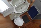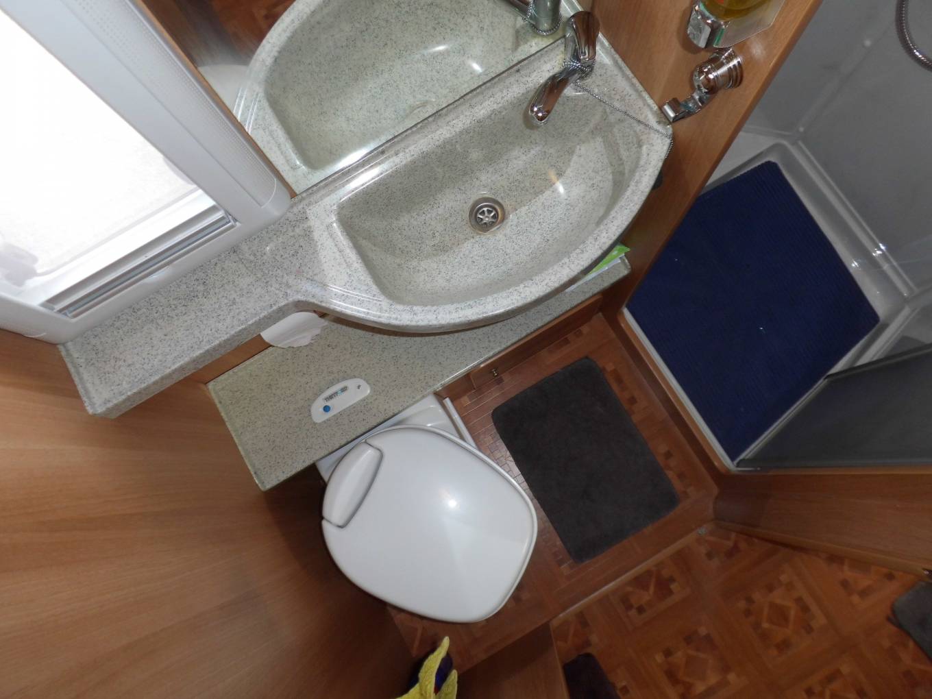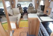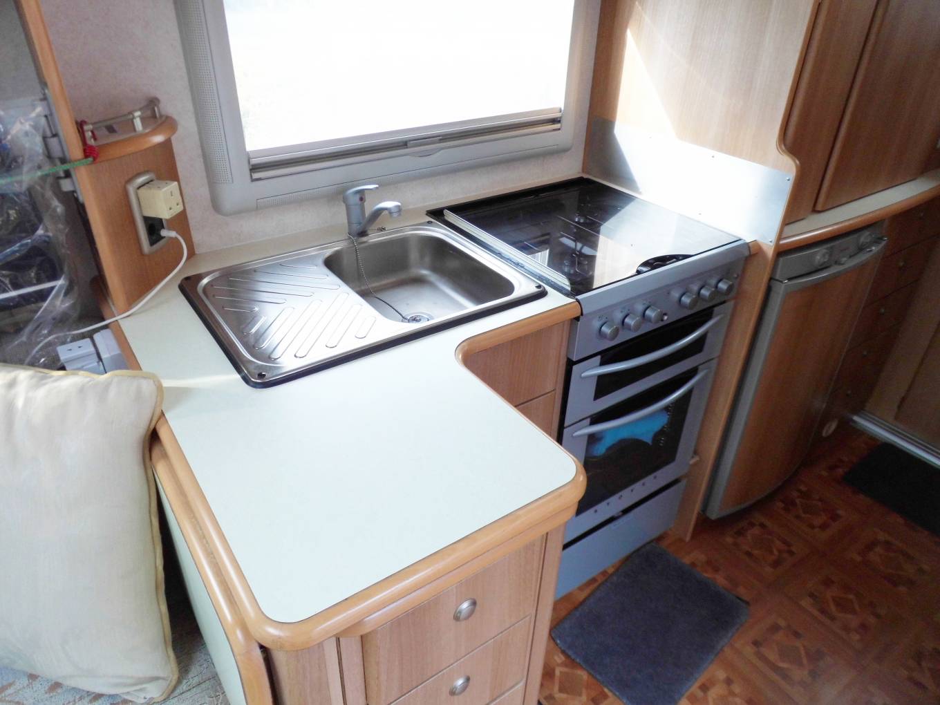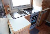 Moving forwards the bathroom is on the left and features a separate shower with screen, a cassette toilet, a wash basin with mixer tap, a mirror and some storage space for your bathroom essentials. The bathroom also has a window. On the other side is the kitchen which has a dual fuel hob with 3 gas burners and 1 electric hotplate, a 3 way fridge freezer, a microwave, a stainless steel sink with mixer tap and lots of cupboard and drawer space.