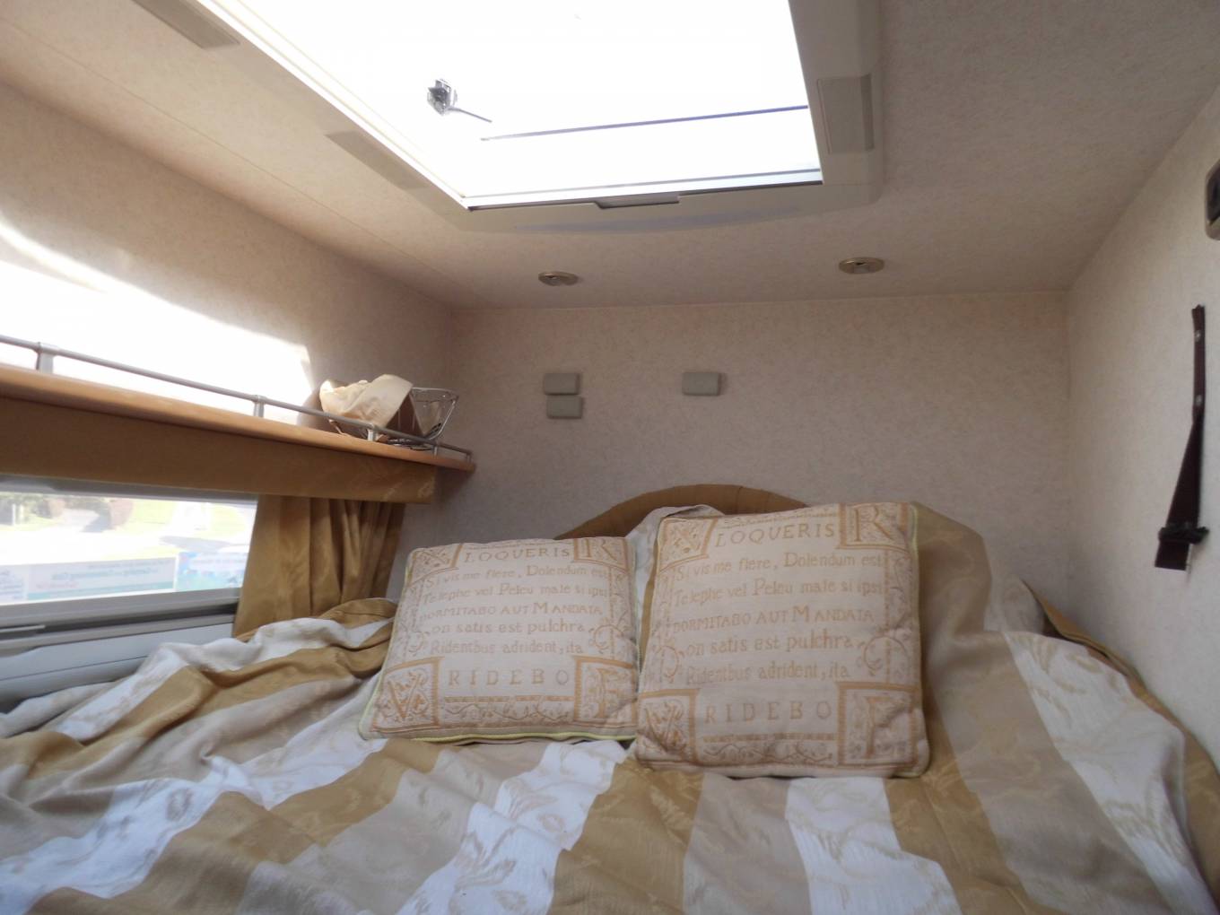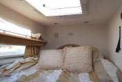 On entering the motorhome the first that strikes you is that there is plenty of space to move around in. Some motorhomes can feel a little enclosed but this Autocruise actually feels larger than it is. At the rear there is a fixed transverse bed measuring 6' 6" x 4' 4" which sits over the rear garage and access to the bed is via a clever ladder which slides away underneath the bed when not in use. There is a large skylight in the bedroom which throws in plenty of natural light.