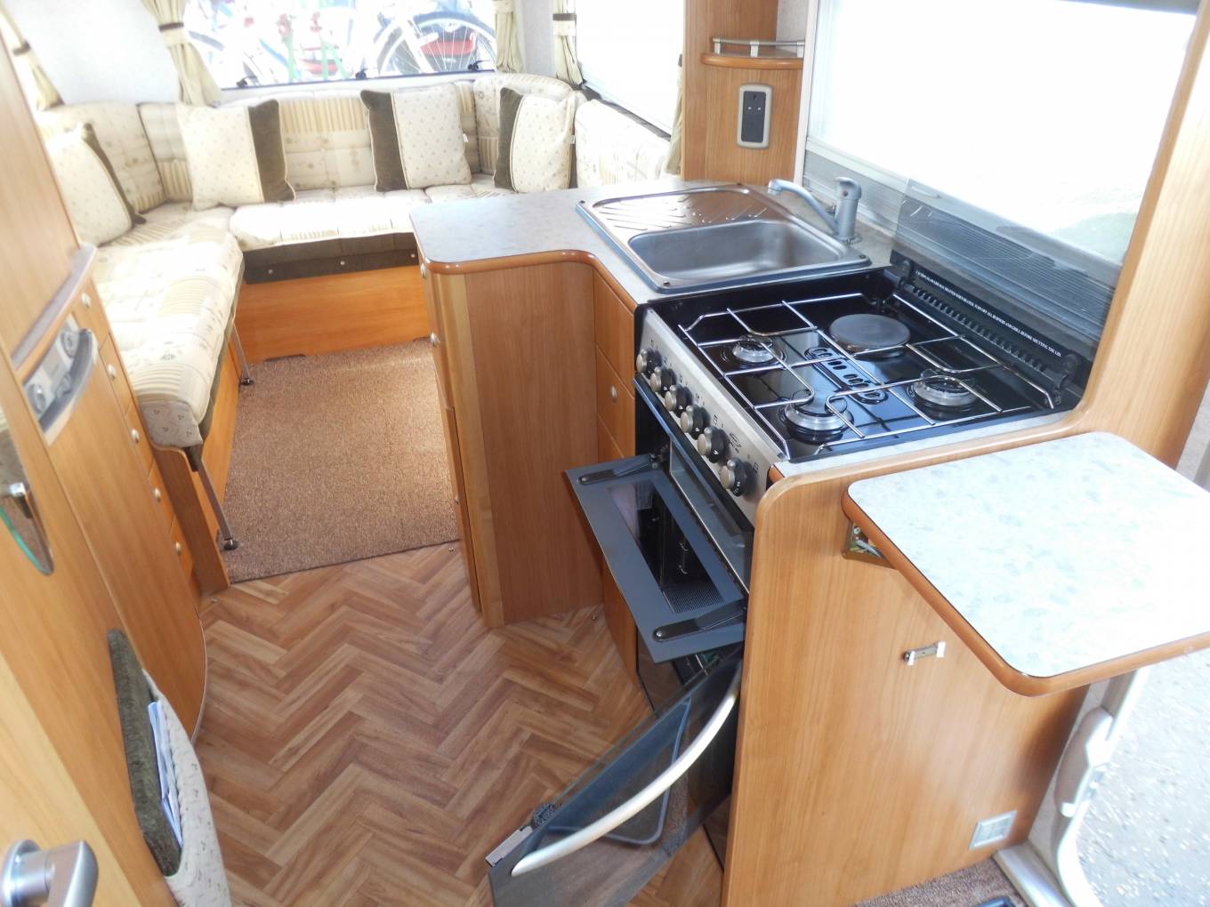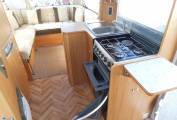 Moving forwards you come to the kitchen which is equipped with an oven and grill, an 81 litre Dometic 3 way fridge freezer, a sink with mixer tap and a hob with 3 gas burners and 1 electric hot plate, so you have all the tools you need to rustle up a gastronomic delight. There are even 2 pop up flaps to increase your work space area.