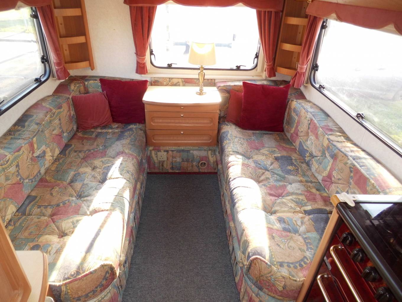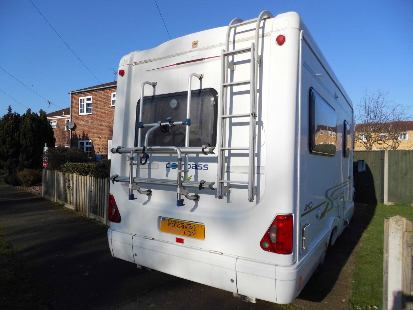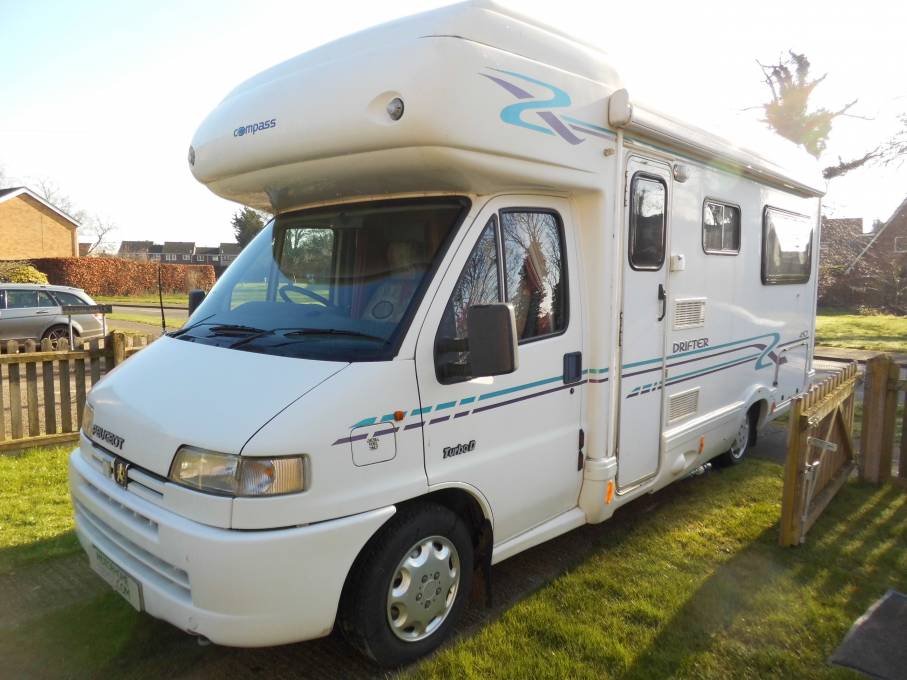Compass Drifter 410 4 berth coach built motor home has a 2.5 litre diesel engine with a 5 speed manual gearbox and 2 seat belts. This is a very spacious and well laid out motorhome and has been owned and well looked after for the last 13 years. On entering the side door of the motor home in front of you is the good size washroom with a window, washbasin, toilet and shower. To the front the over cabin bed is also a good size bed. The passenger captain seat swivel. Turning Right there is a fully equipped kitchen consisting of grill, gas hobs, fridge with a small freezer compartment, sink and drainer. To the back there is a really good size U shaped lounge area that also turns in a double bed. Each window has fly screens and blackout blinds. This motor home comes with lots of storage space bike rack, new Habitation certificate new leisure battery and service. .