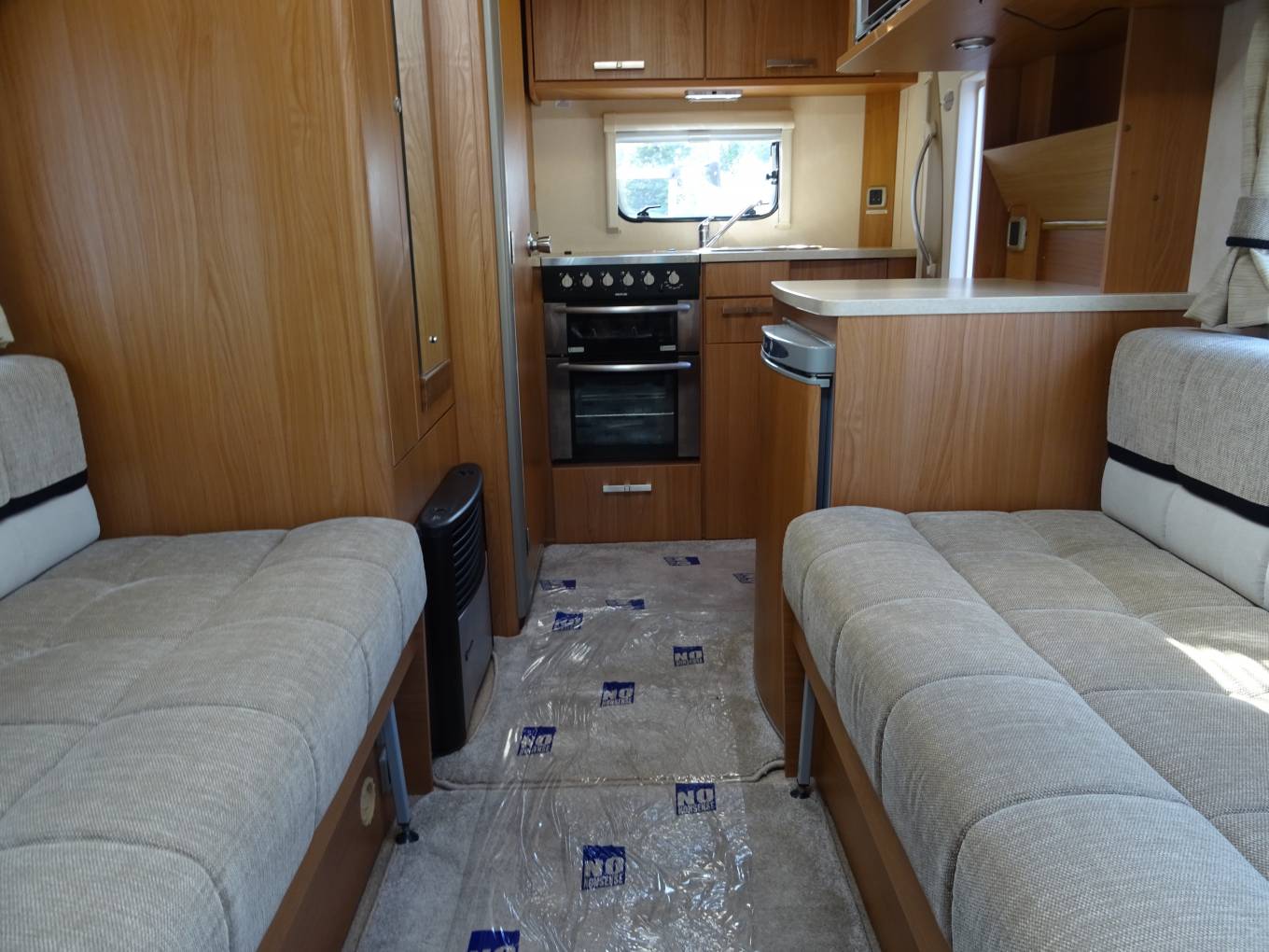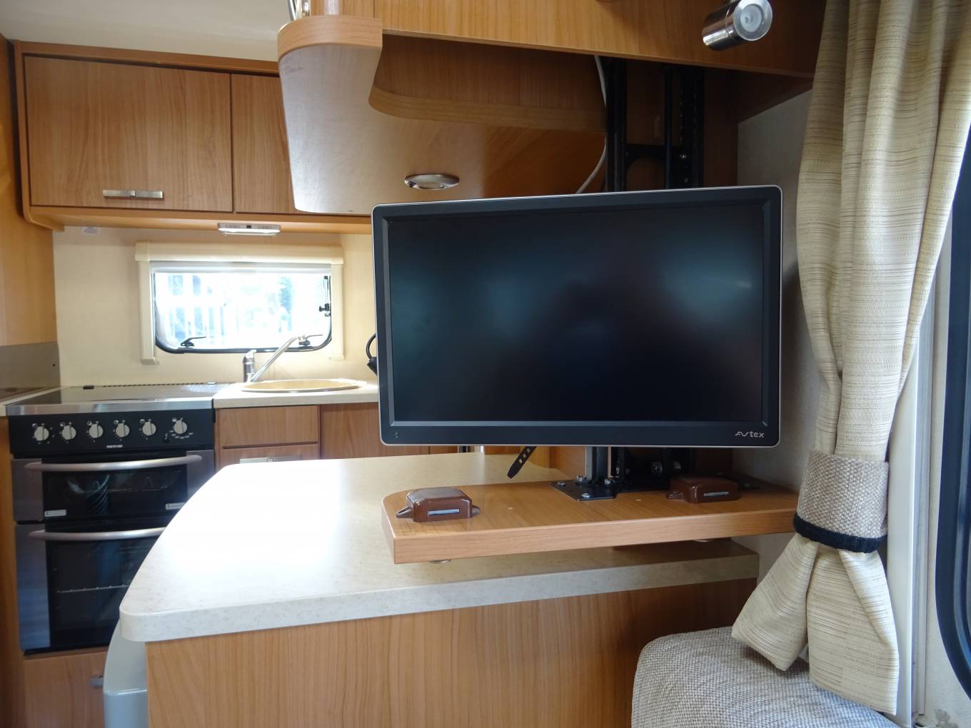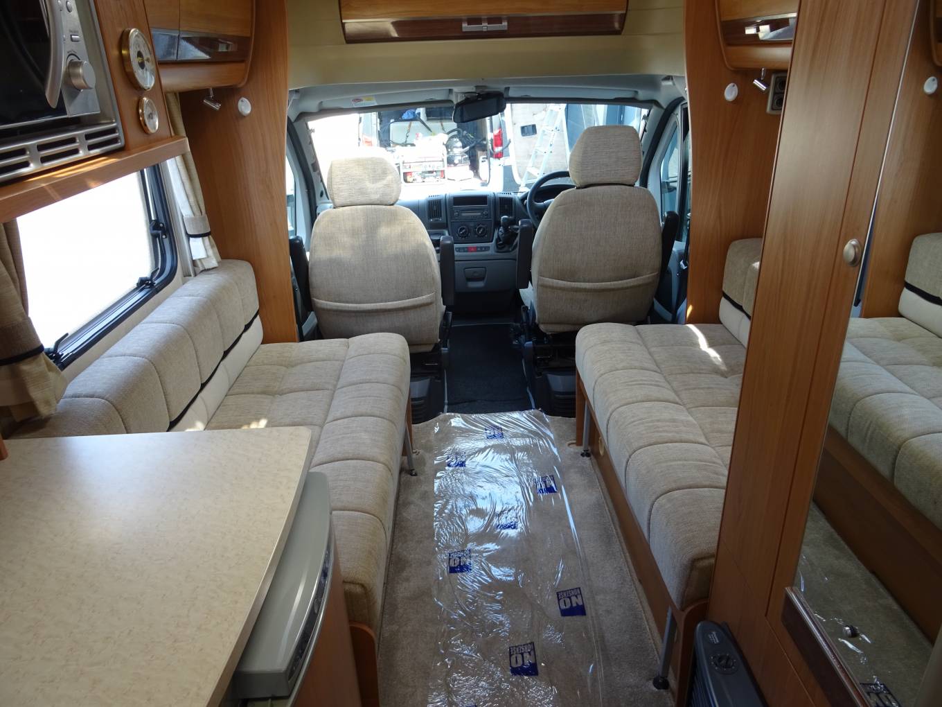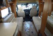 Although only 5.49 meters long it feels larger than its size inside with a spacious lounge area having enough room to entertain at least 6 people when the front seats swivelled round - the neutral upholstery gives it a very light and airy atmosphere in which to which to relax and watch the drop down AVTEX TV.