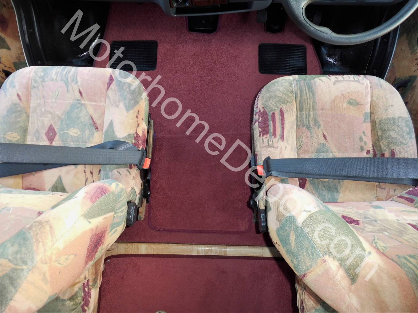 Moving on to the cab area, there is over-cab storage, very well designed as a cupboard. Both driver and passenger seats have 3 point seat belts, there is a radio, reversing monitor on the dashboard and curtains that pull round the windows for privacy