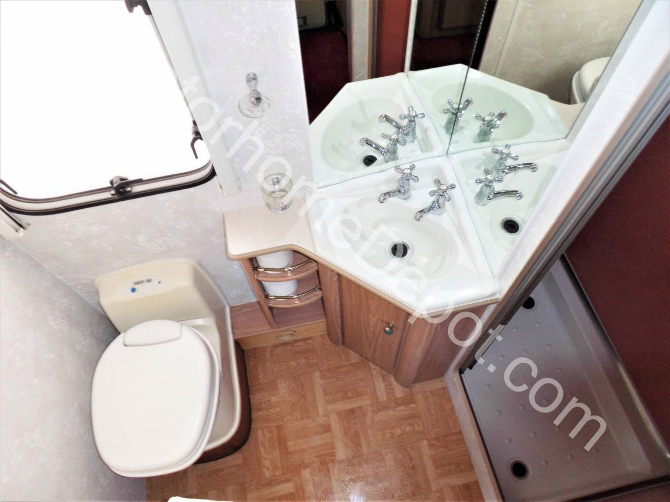 Moving to the nearside there is a Fiamma F45 Plus wind-out canopy over the habitation door. Entering this door and on the right is the rear end kitchen with sink and mixer tap. Next to this is a full size cooker with oven, grill and four gas ring hob. Straight ahead is the washroom with washbasin, toilet and separate shower