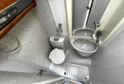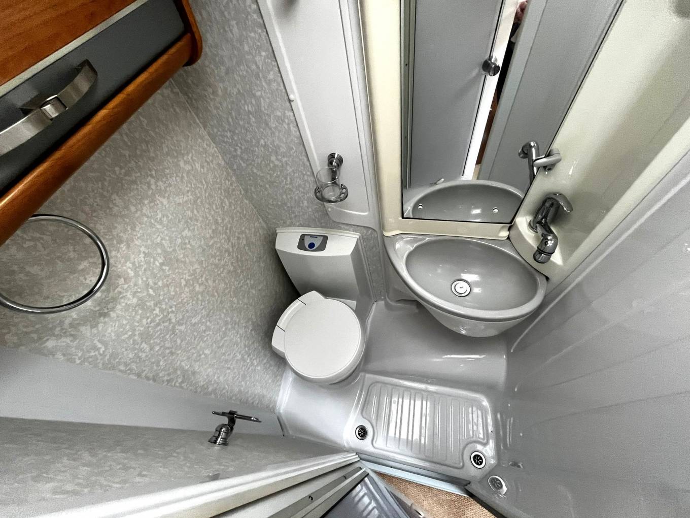 The washroom is generous in size and houses the cassette toilet, handwash basin with shower tap.