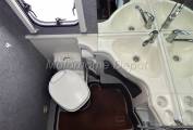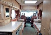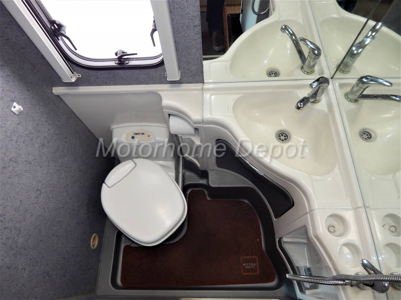 The bathroom situated opposite is spacious & light is flooded in through a side window. The toilet a Thetford Cassette style with a fresh water flush with swivel top. There is a built in wash hand basin with Chrome mixer tap. The integral shower is separated using a shower curtain.