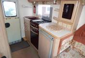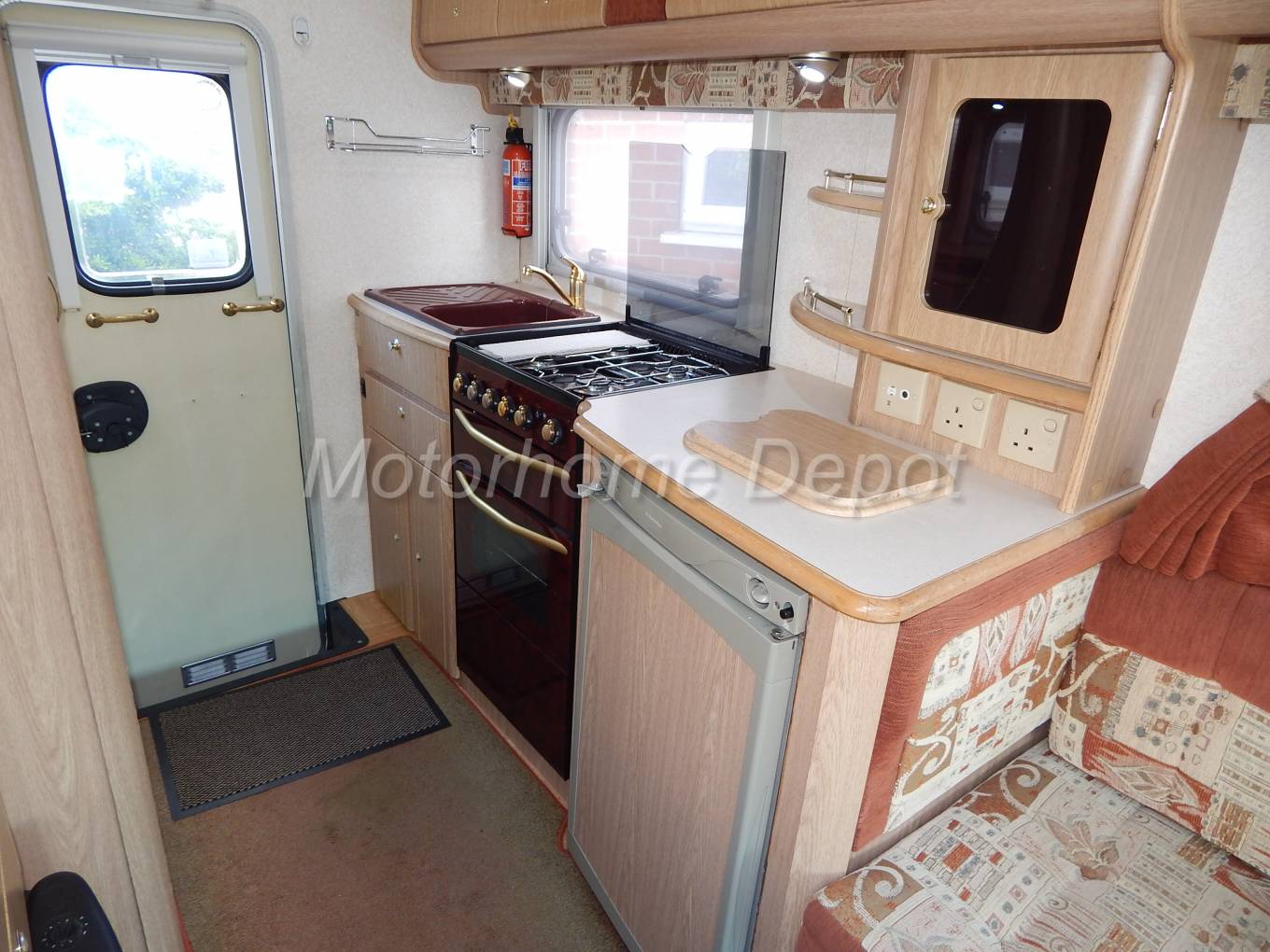 This popular compact van is entered from the rear via an electric step, the kitchen area is immediately on the left which consists: large sink & drainer with a Gold chrome effect mixer tap; full size oven and grill with a 4 burner gas hob. There is a Dometic absorber fridge under the counter which has a separate freezer compartment and can be powered by 240V 12V or gas depending on whether you are plugged in on site or wild camping.