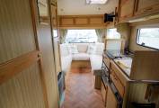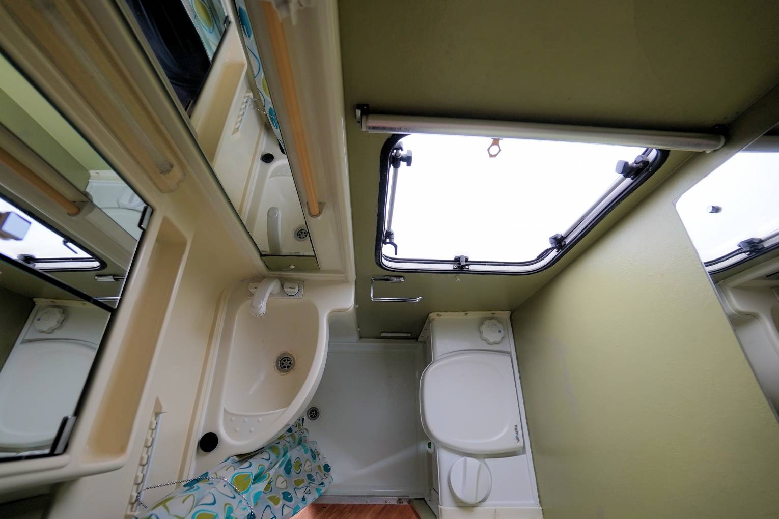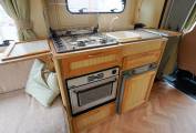 The kitchen area has a 3-burner gas hob, sink with mixer tap and 3-way fridge with small freezer compartment all in clean condition. Adjacent the washroom has a washbasin with mixer tap, cassette toilet, vanity unit and shower.