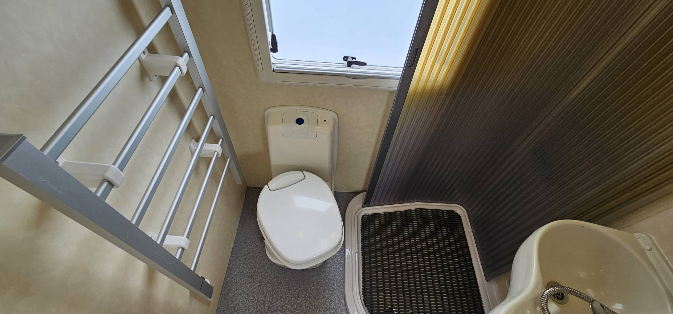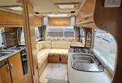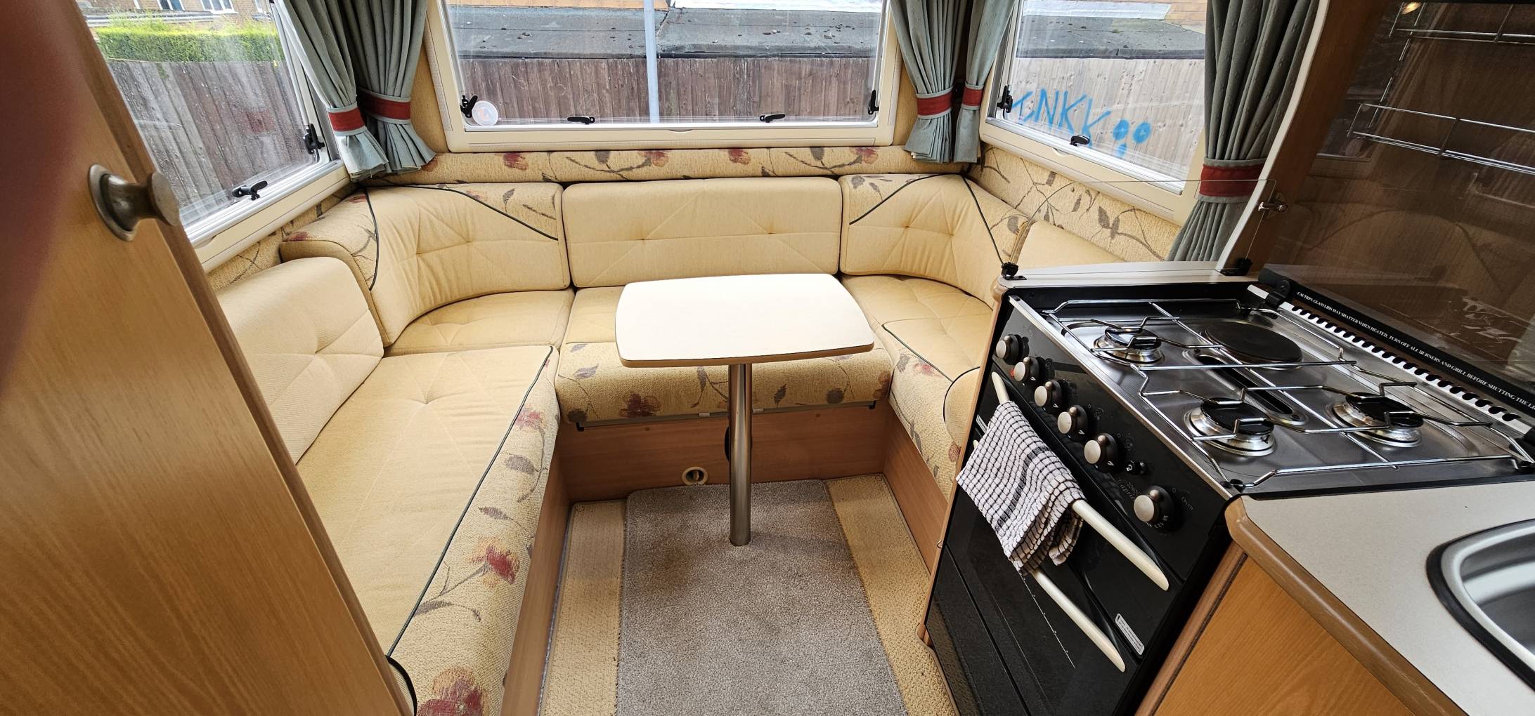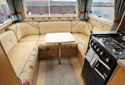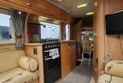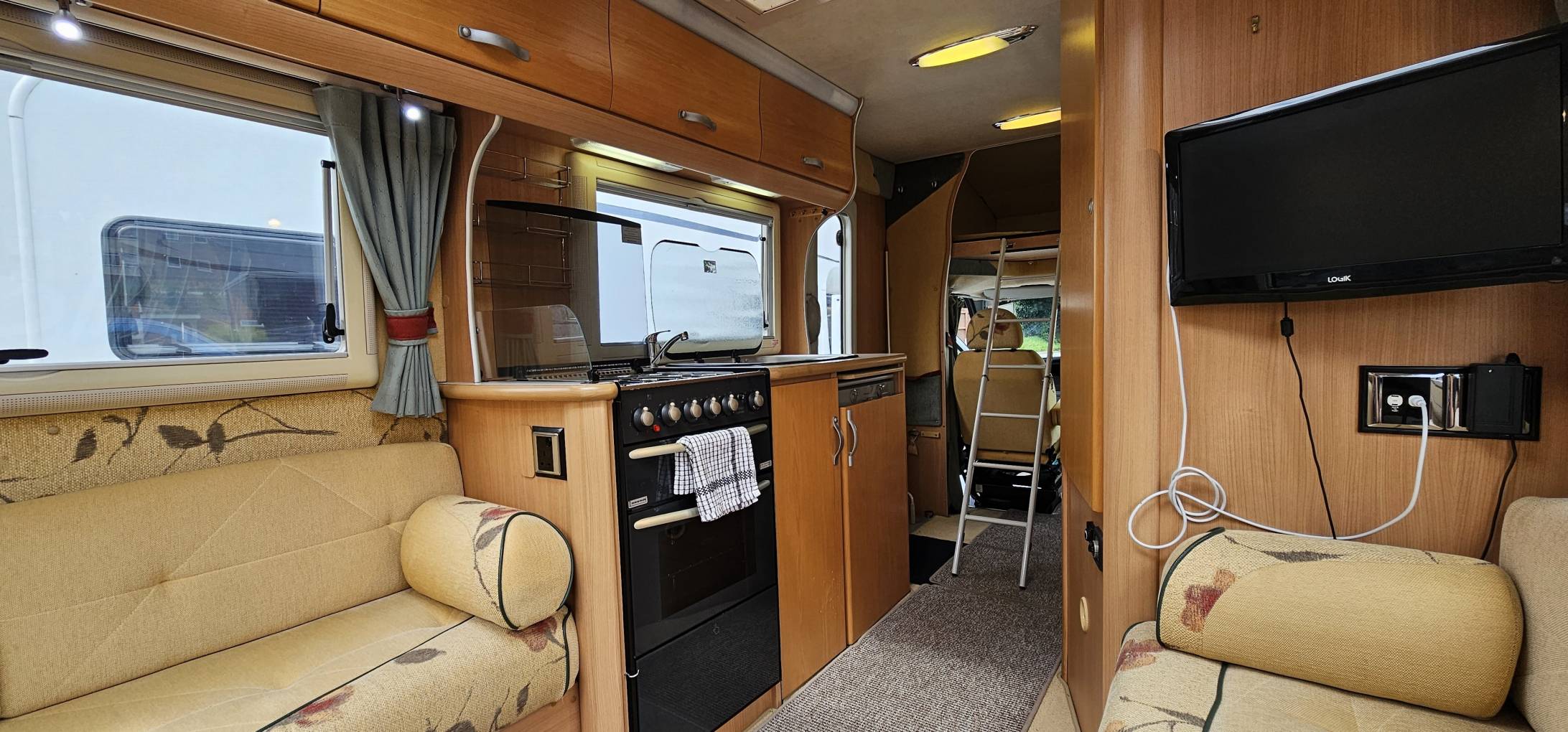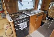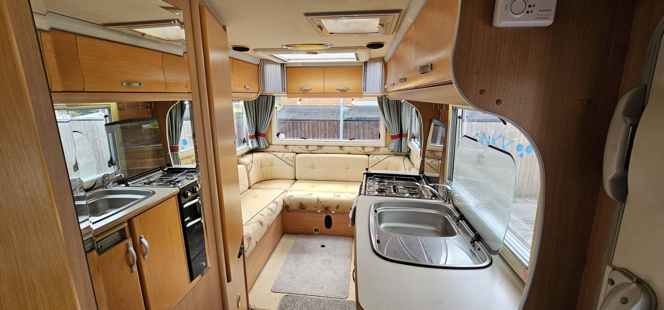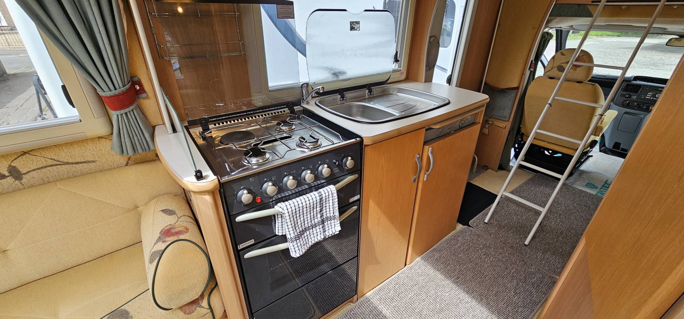 The kitchen is typically well equipped with everything you could need including a full oven and grill, a three-way fridge with freezer box and a good-sized work top with basin and mixer tap. The washroom comprises of an electric Thetford toilet, towel radiator and a separate shower where the wash basin is also located.