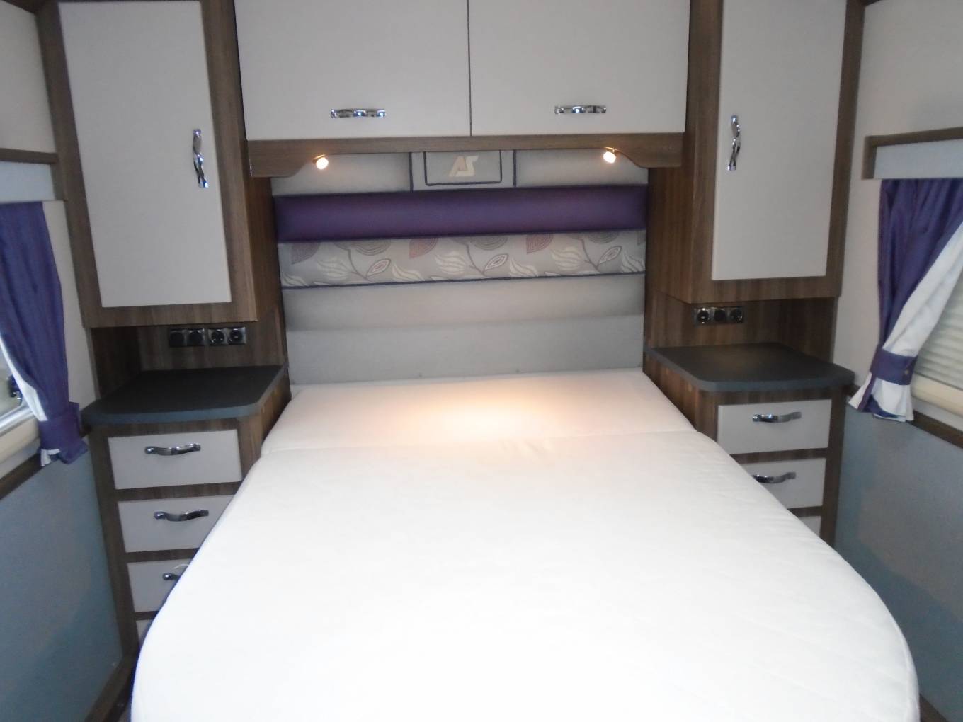 Open the door and you are in a beautiful bedroom with the fixed bed sitting central to the two generous wardrobes and bedside cabinets with a logo AS padded headboard all as standard.