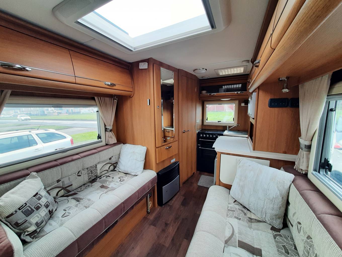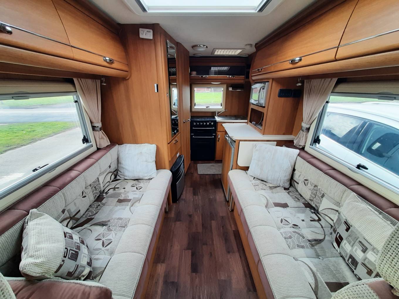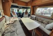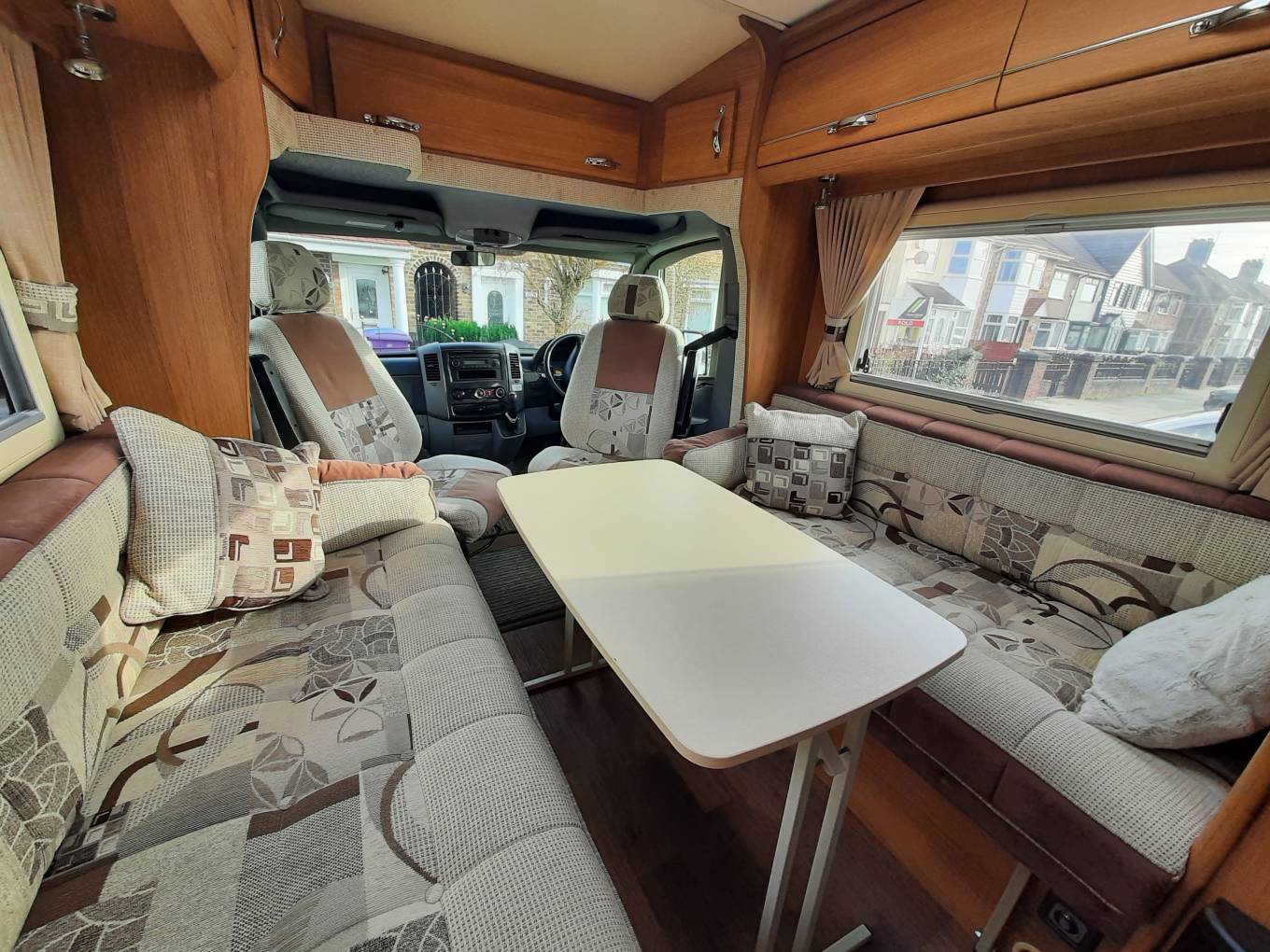 The lounge area is bright and airy with two large side windows and a large sunroof, two parallel side sofas that pull together in the evening to make a large double bed. There is a large folding dining table that stores away when not in use, upper aircraft style lockers and under-seat storage available.