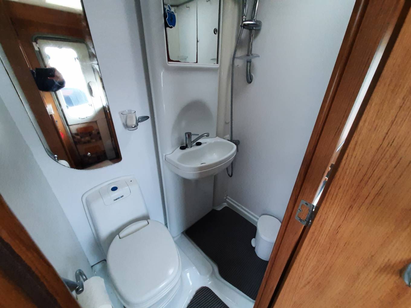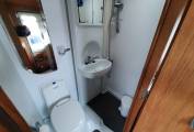 The washroom is very cleverly designed, with a built-in washbasin with chrome tap and mirrored cabinet above, the whole panel swings out towards the toilet to reveal a large separate shower cubicle, so the rest of the washroom stays dry whilst you’re showering, plus there’s a Thetford cassette swivelling toilet with electric flush.