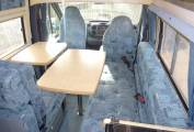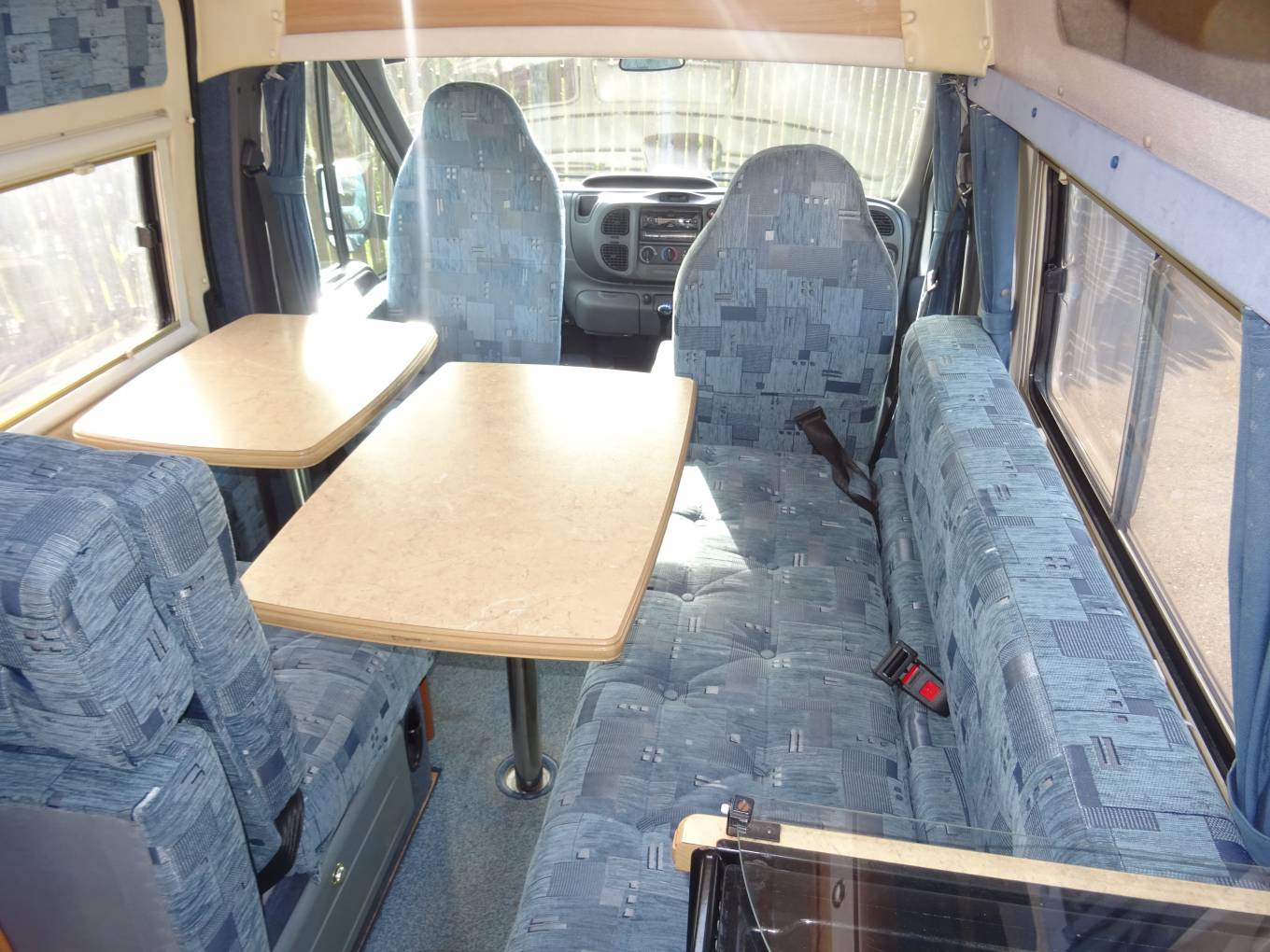 Open the side sliding door and step inside to the lounge and dining area, with a side sofa that has two seatbelts and a forward facing single seat that has one seatbelt. There are two fixing points for the dining table or the coffee table with a chrome leg's that stows away when not in use. There is a swivel seat from the front cab and this area converts to two single beds or a large double bed in the evening. There are storage areas beneath the seats, a large storage cabinet above the cab, a HEKI II opening sunroof floods the lounge with natural daylight.