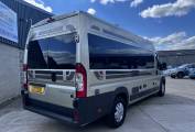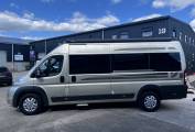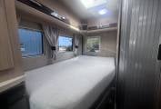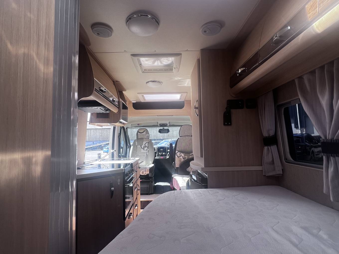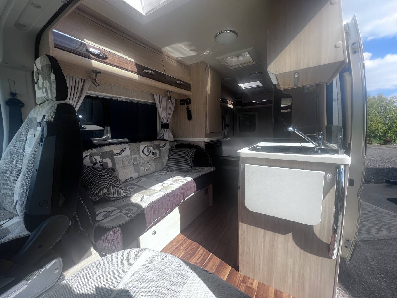 At the rear you have a french bed and washroom. In the centre is you kitchen area which has all of your usual appliances. Towards the front where your side opening door is you have a full bench seat which has a table which can be popped up to create an area for activities and eating inside the motorhome. This area can also adapt to add another 2 seats with the driver and passenger seats as they swivel round to face the rear of the motorhome.