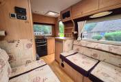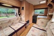 As you move forward into the front lounge, this area is bathed in light courtesy of the Large Rooflight above. There are 2 sofas which turn into a large double bed measuring 4 feet 8 inches x 6 feet 6 inches. The Sofas also convert into travelling seats (with seatbelts) if required.