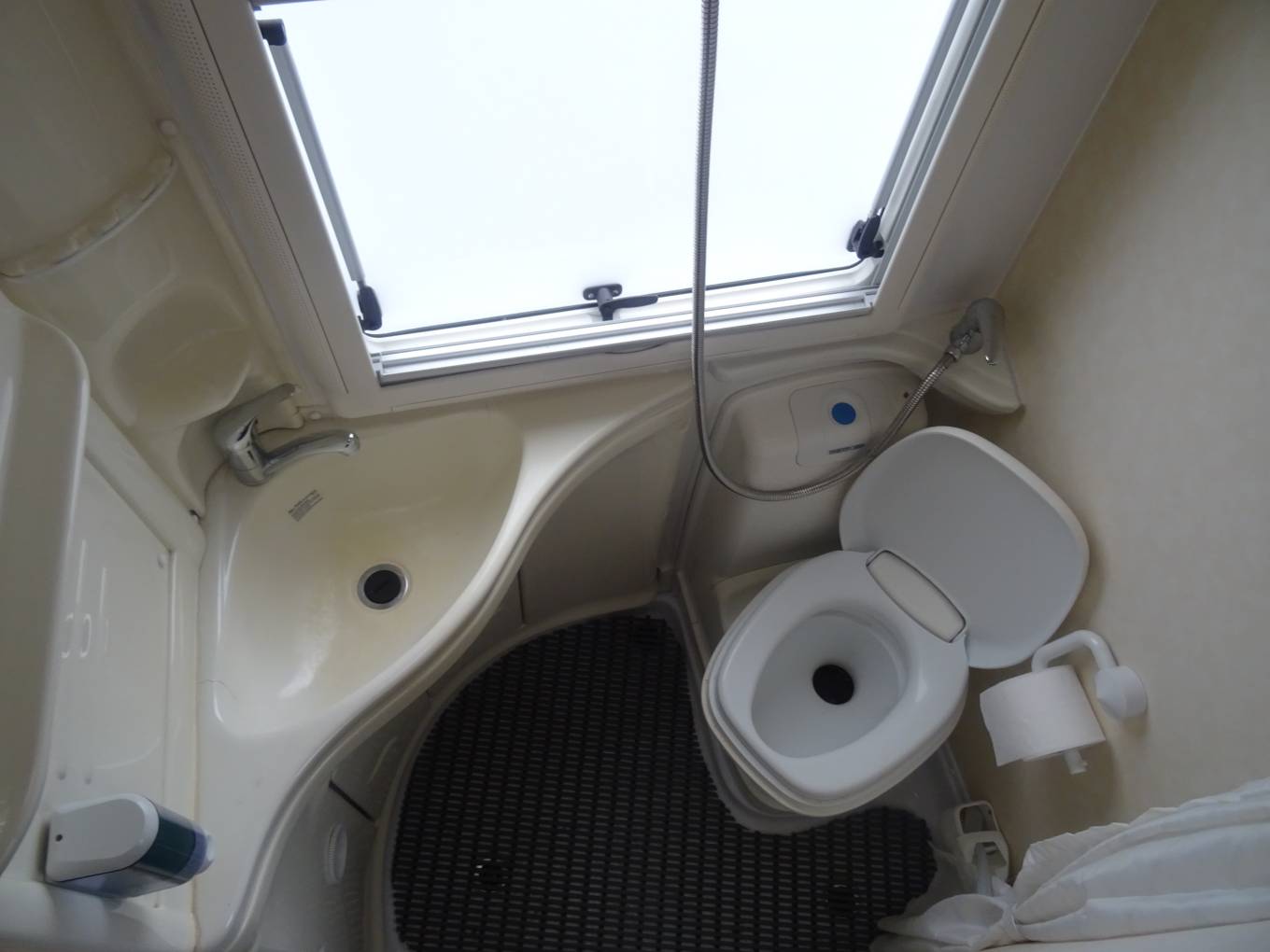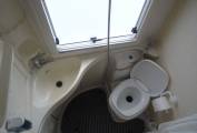 shower and washroom with a corner sink, a swivel Thetford toilet and a separate