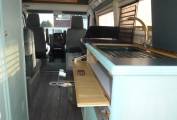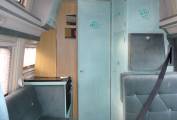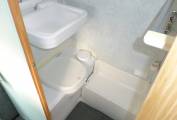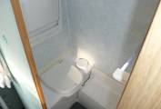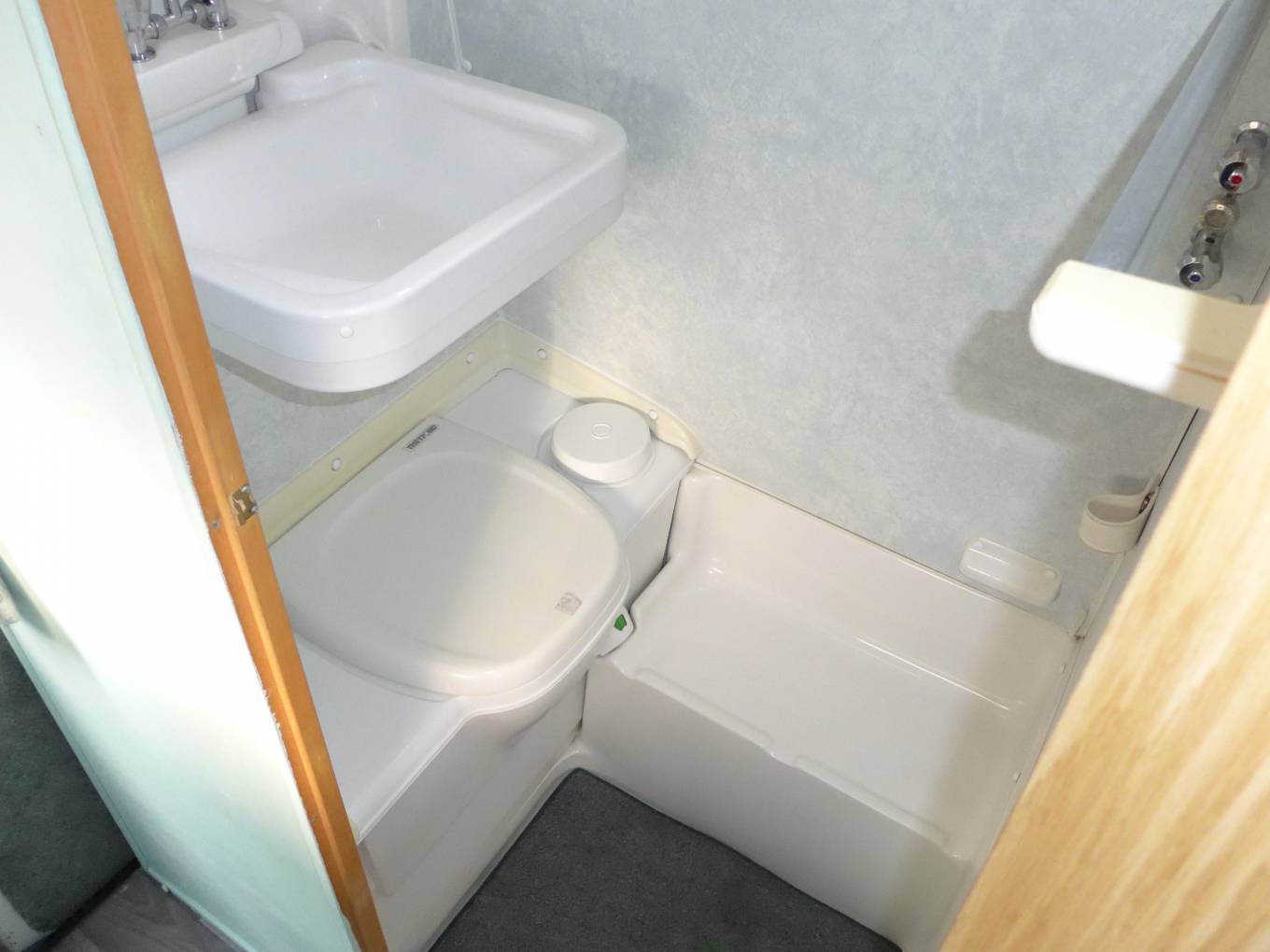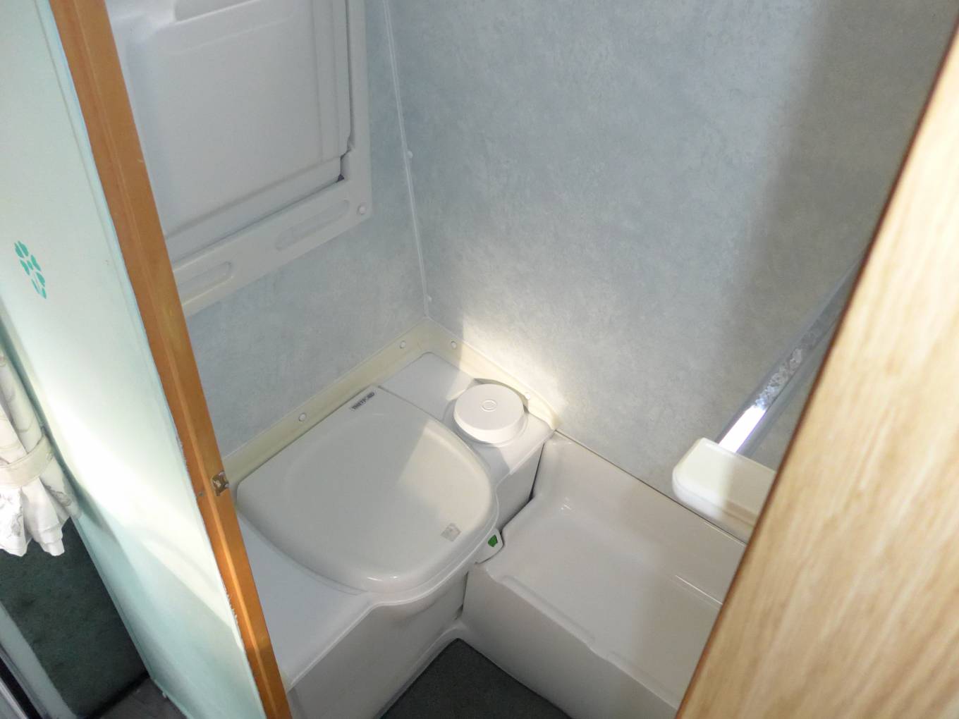 Rear washroom with cassette toilet, folding wash basin and shower facility. The washroom door folds out to the full width petition of the van to provide dressing area.