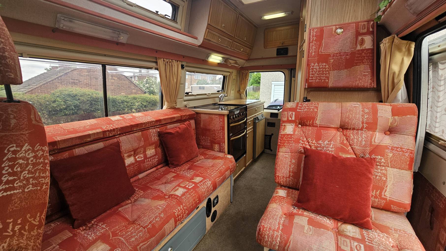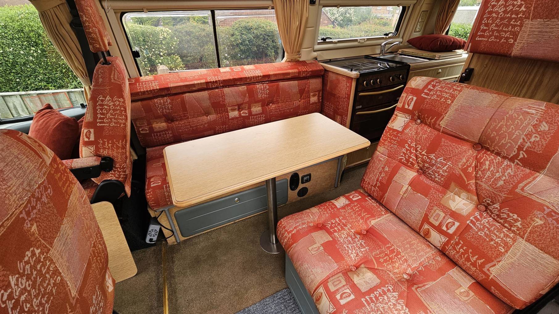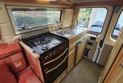 Mid habitation you enter through the side sliding door and you will be greeted with a single forward facing seat which comes with a travelling belt, behind the driver’s seat you have a double lounge bench, which in the evening alongside the single seat will transform and provide a spacious double bed. The van also comes with 2 x hide away table's and the passenger seat is a swivel seat which will be great when eating and entertaining in the lounge area. The van also has a tow bar fitted which is often a desired feature and plenty of storage space.