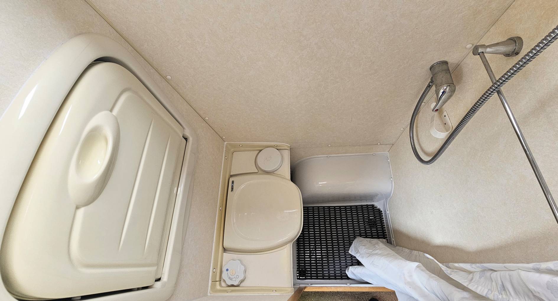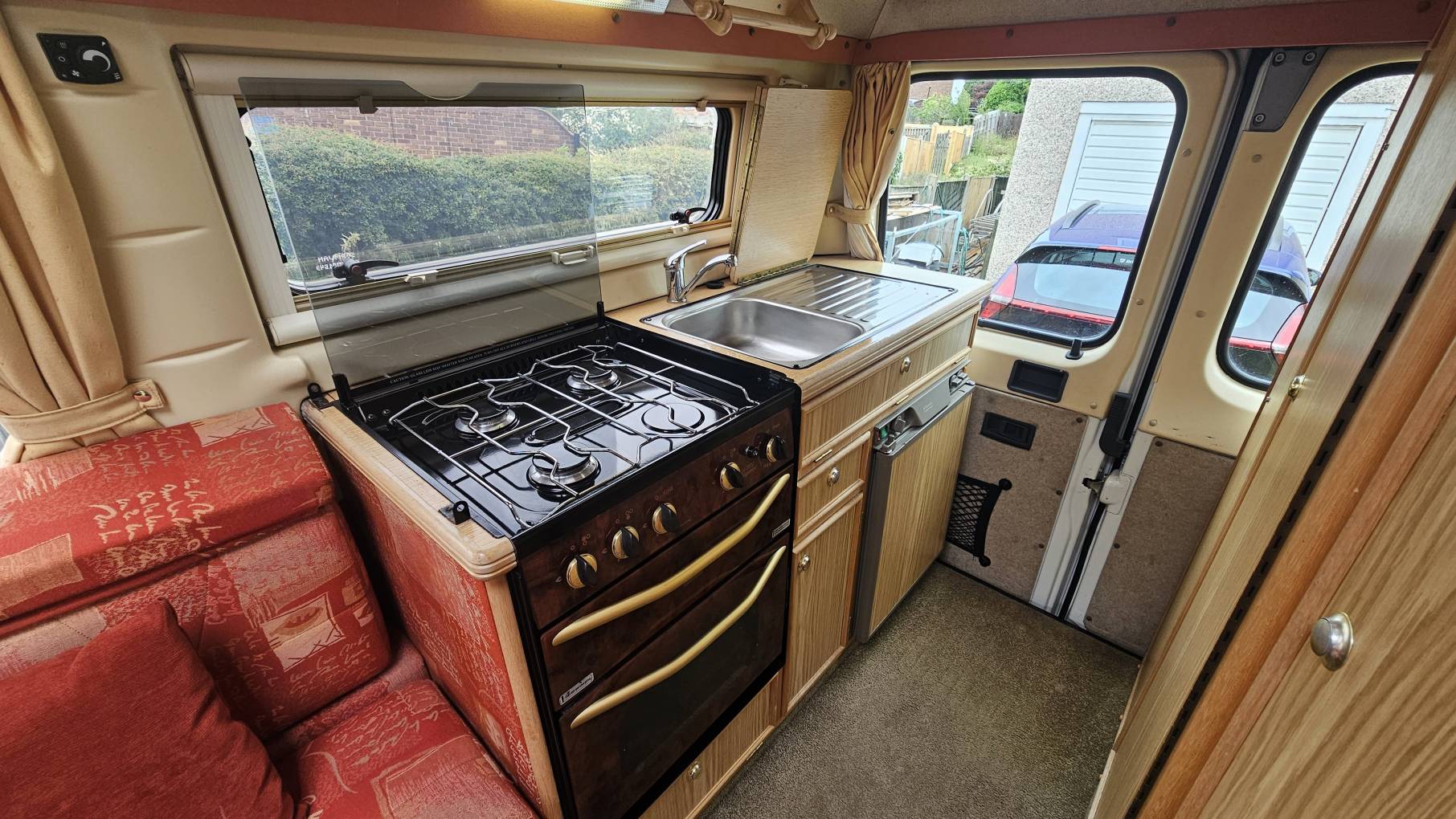 Starting at the rear of the van, you have an end kitchen with the washroom adjacent. The Kitchen comes with an oven, grill and a 3 burner gas hob, 3 way fridge with a small freezer compartment and a sink which also has a drainer, the washroom whilst compact comes with everything you need to refresh and recharge after a day of exploring, with a drop down basin, toilet, and shower.