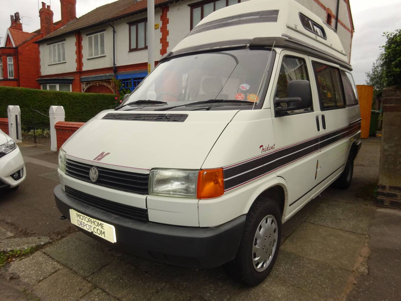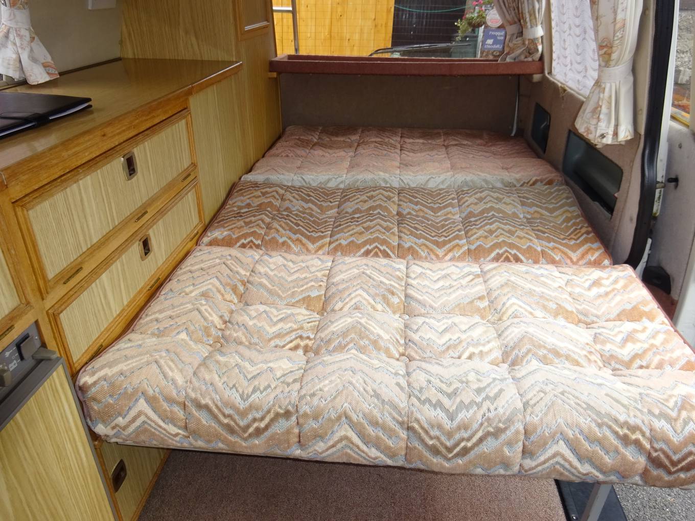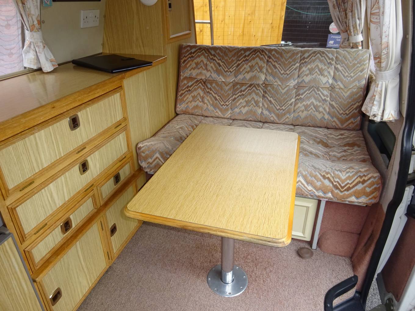 We present for sale this 1992 (J reg) Autosleeper Trident. Layout is a camper van with a rock and roll bed. Looking in from the side door you have the swiveling passenger seat with a small table on your left, the kitchen is in front of you and the folded up rock and roll bed to your right. The kitchen specification includes a 2 gas burner hob, a grill, stainless steel sink with drainer and then a storage unit. The decent size fridge is under the grill. With the 3 lift up lids down there is good workspace. There are 5 cupboards of various sizes under the sink. The gas bottle lives under the wardrobe at the rear. The second, larger table is mounted on a tube in front of the rear seat. There are two seat belts in the back. A pota poti lives in the bottom cupboard. The bed is easy to pull out and gives a space about 6' 2" long by 3' 8" wide. More storage is available in the small wardrobe and the upper front cupboards. There are two sections not shown in the photos that forms a small double above the lounge area. Current owner has used this area to store bedding. High level windows in the loung give a nice airy feeling. Condition is very good for the age of the vehicle, seats are clean and tidy with only the rear shelf showing its age. Hot air heating is from the Propex system.