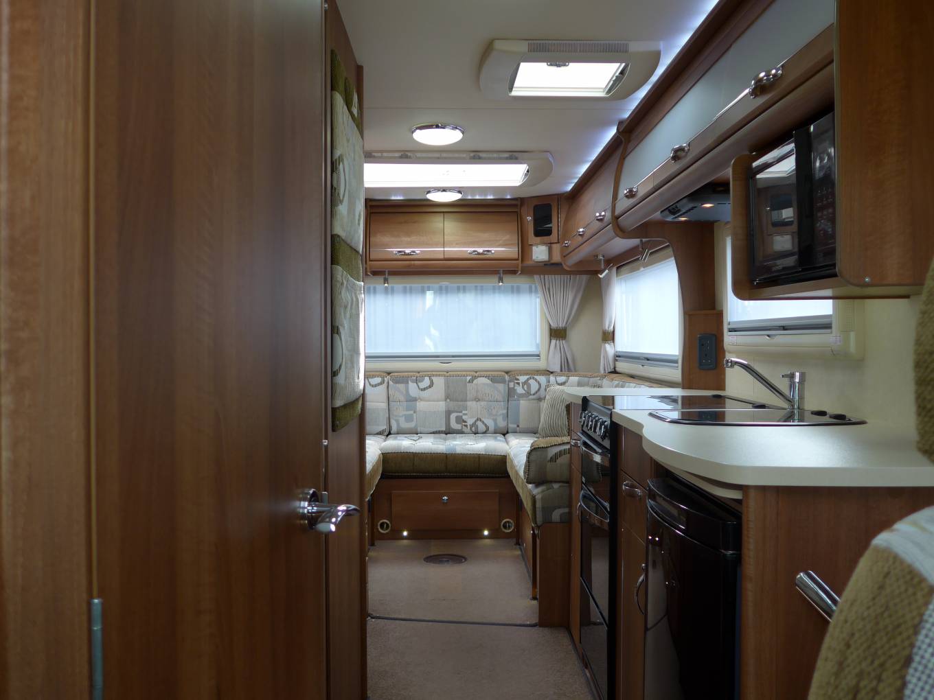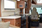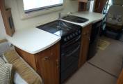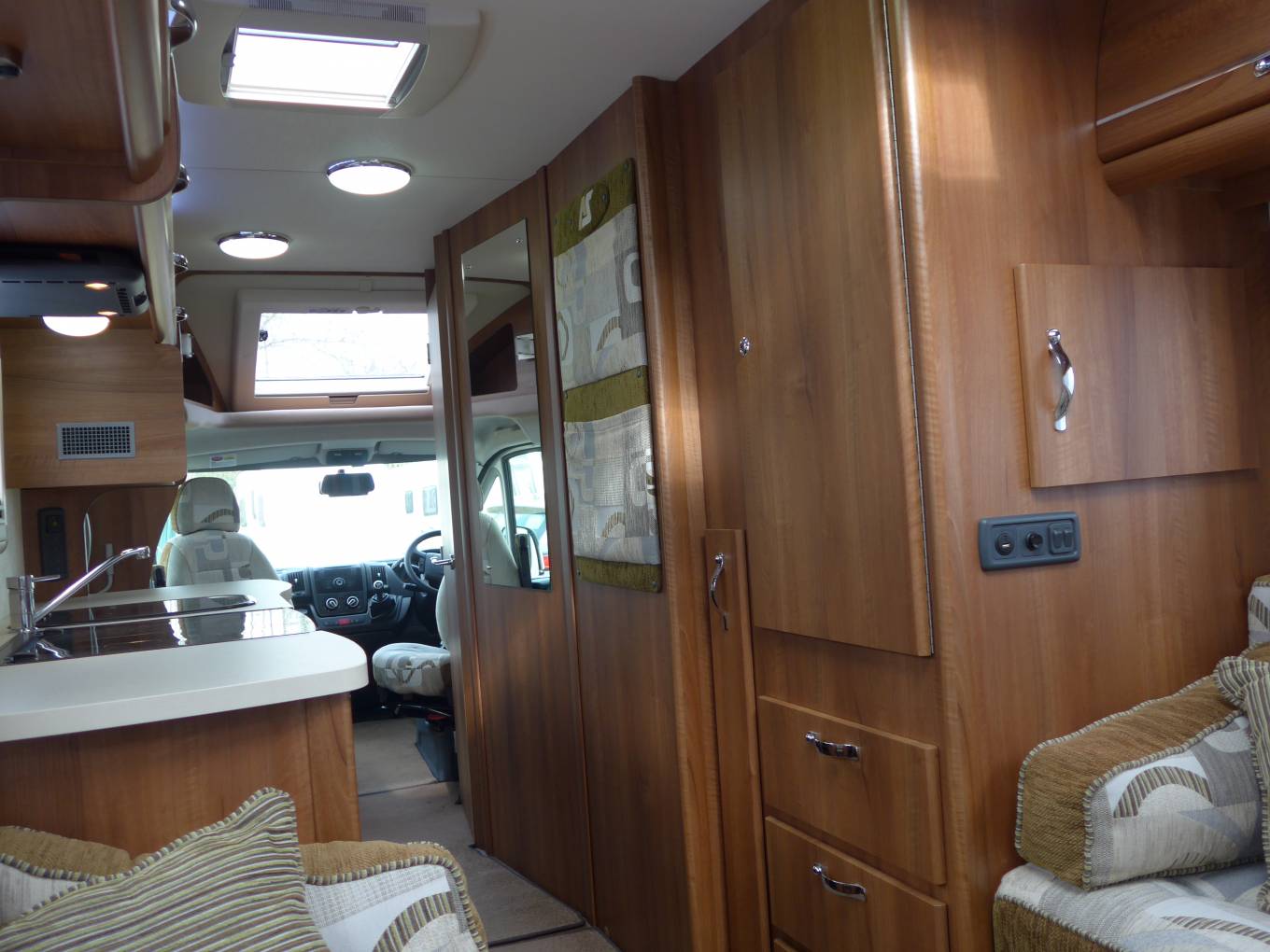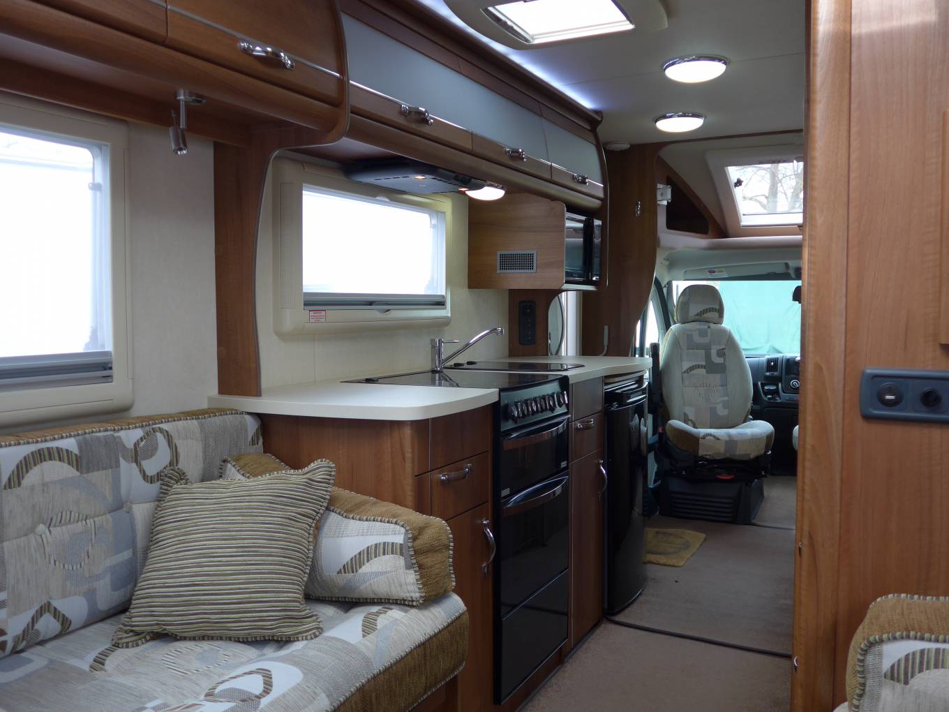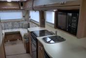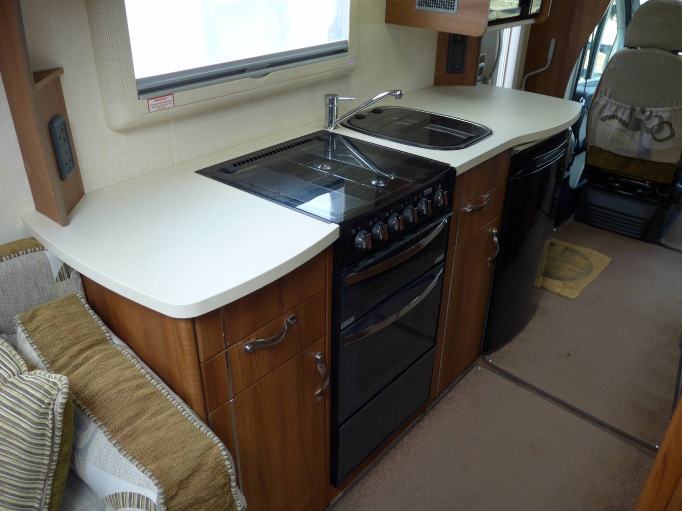 Kitchen with full dual fuel cooker with 3 gas burners, one electric hot plate, grill and oven, Stainless steel sink with chrome tap and drainer. Automatic 3 Way fridge, Extractor fan and Microwave. Tall wardrobe with 3 Drawers. Extensive storage in overhead lockers, over cab and under seating and External Lockers. Cab Swivel Seats.