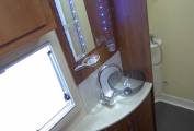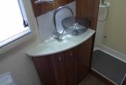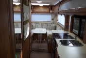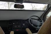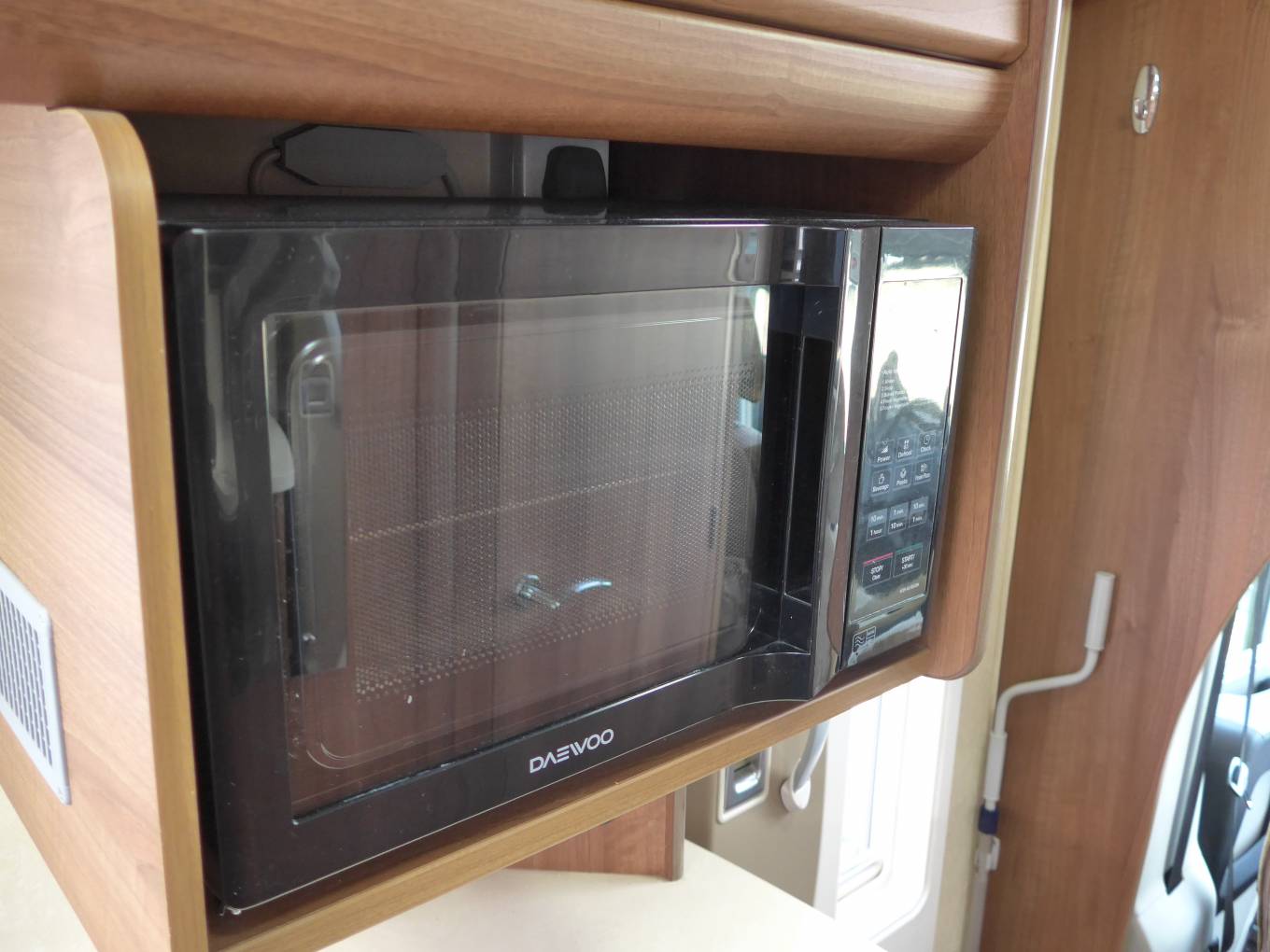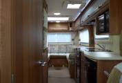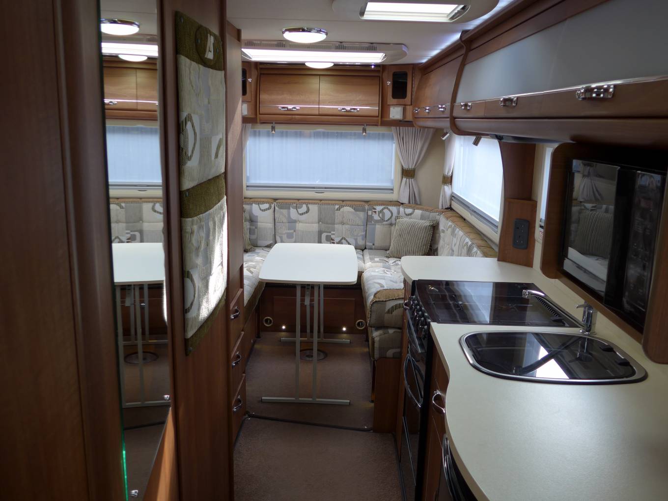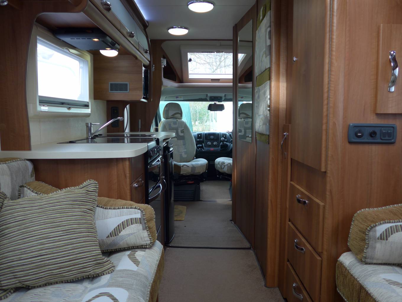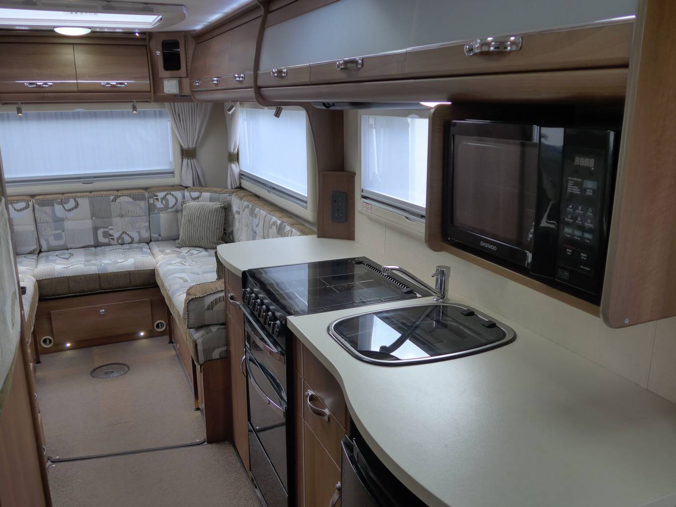 Kitchen with full dual fuel cooker with 3 gas burners, one electric hot plate, grill and oven, Stainless steel sink with chrome tap and drainer. Automatic 3 Way fridge, Extractor fan and Microwave. Tall wardrobe with 3 Drawers. Extensive storage in overhead lockers, over cab and under seating and External Lockers. Cab Swivel Seats.