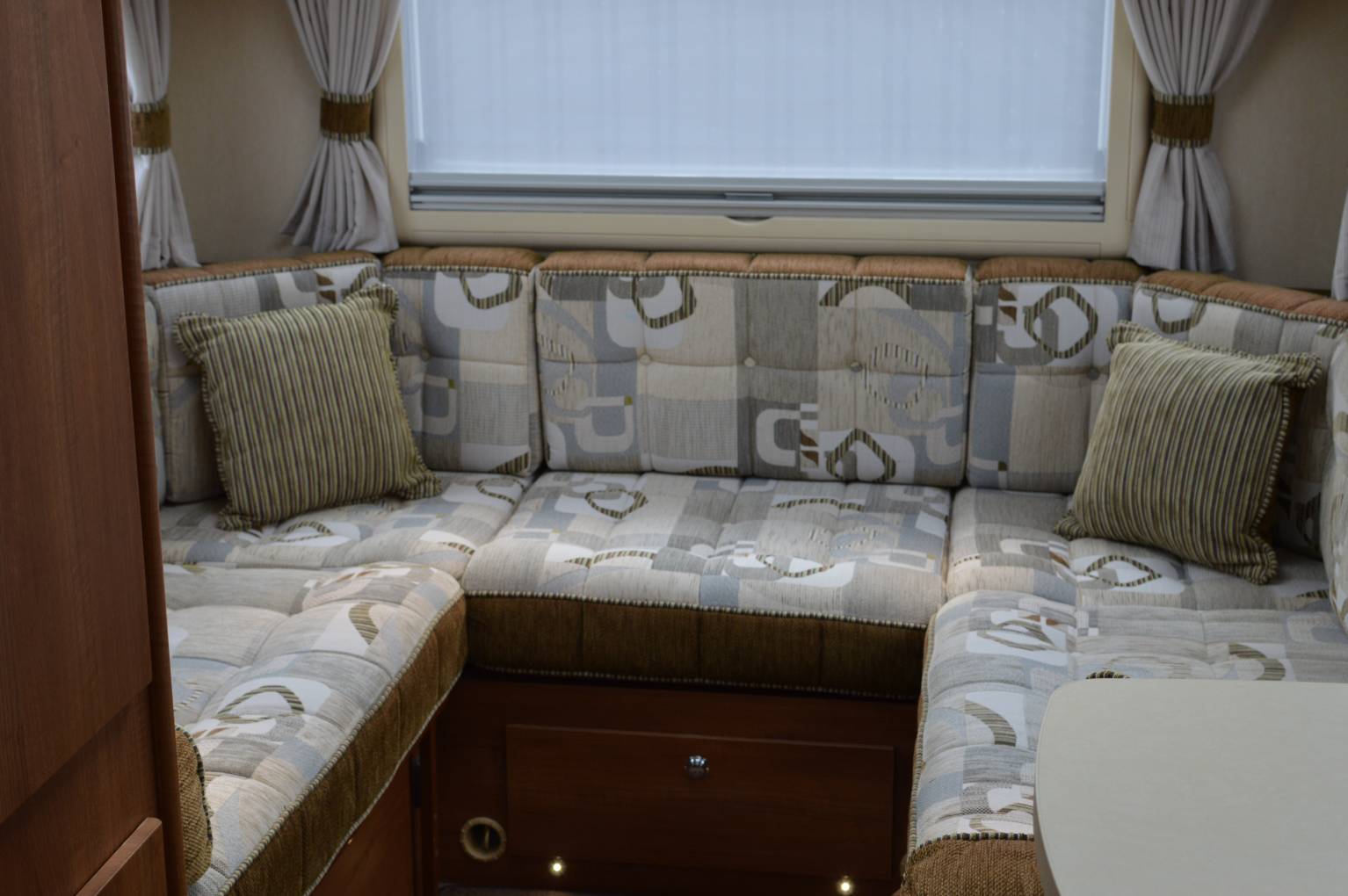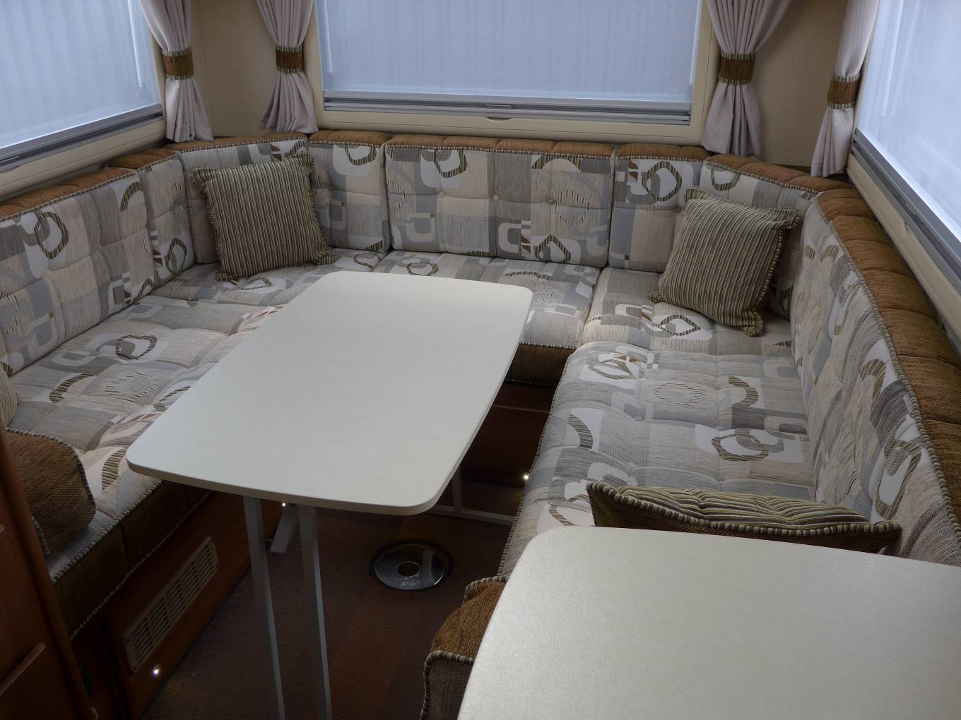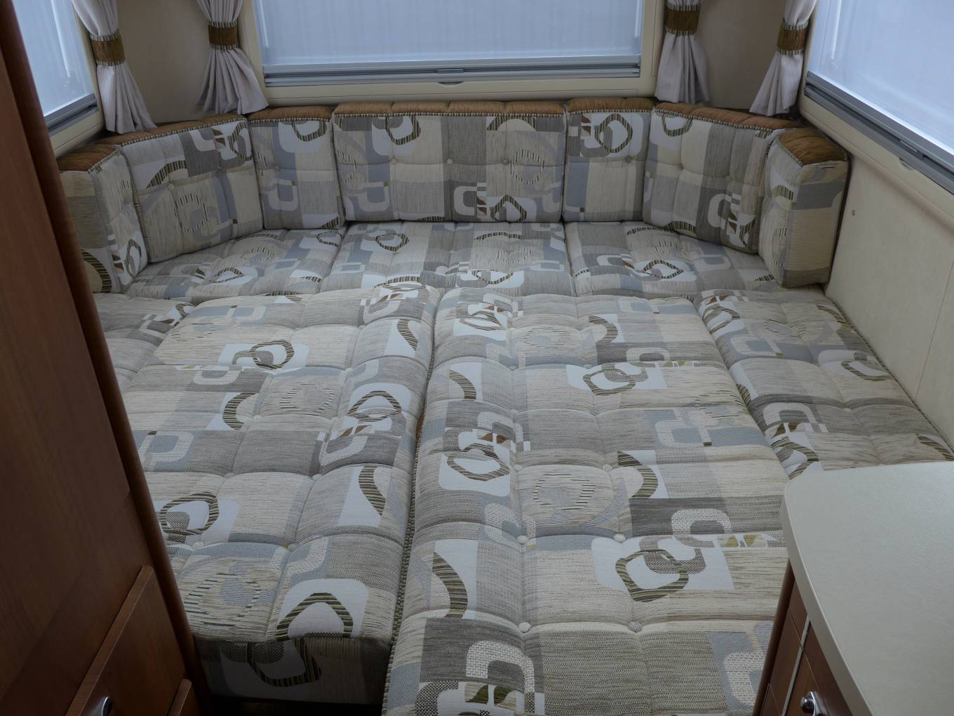 Designed to provide maximum living space with large U shaped Lounge which can convert into two Single beds or one large Double. Upholstered in an attractive neutral coloured cloth. Large dining room table and small coffee table options. TV Cabinet.