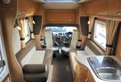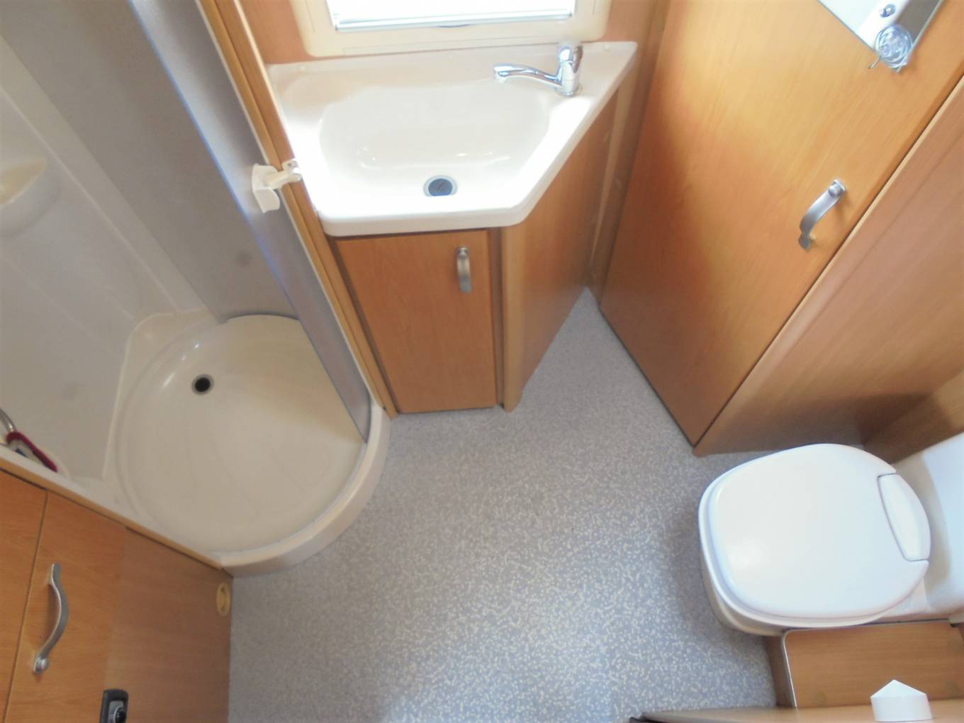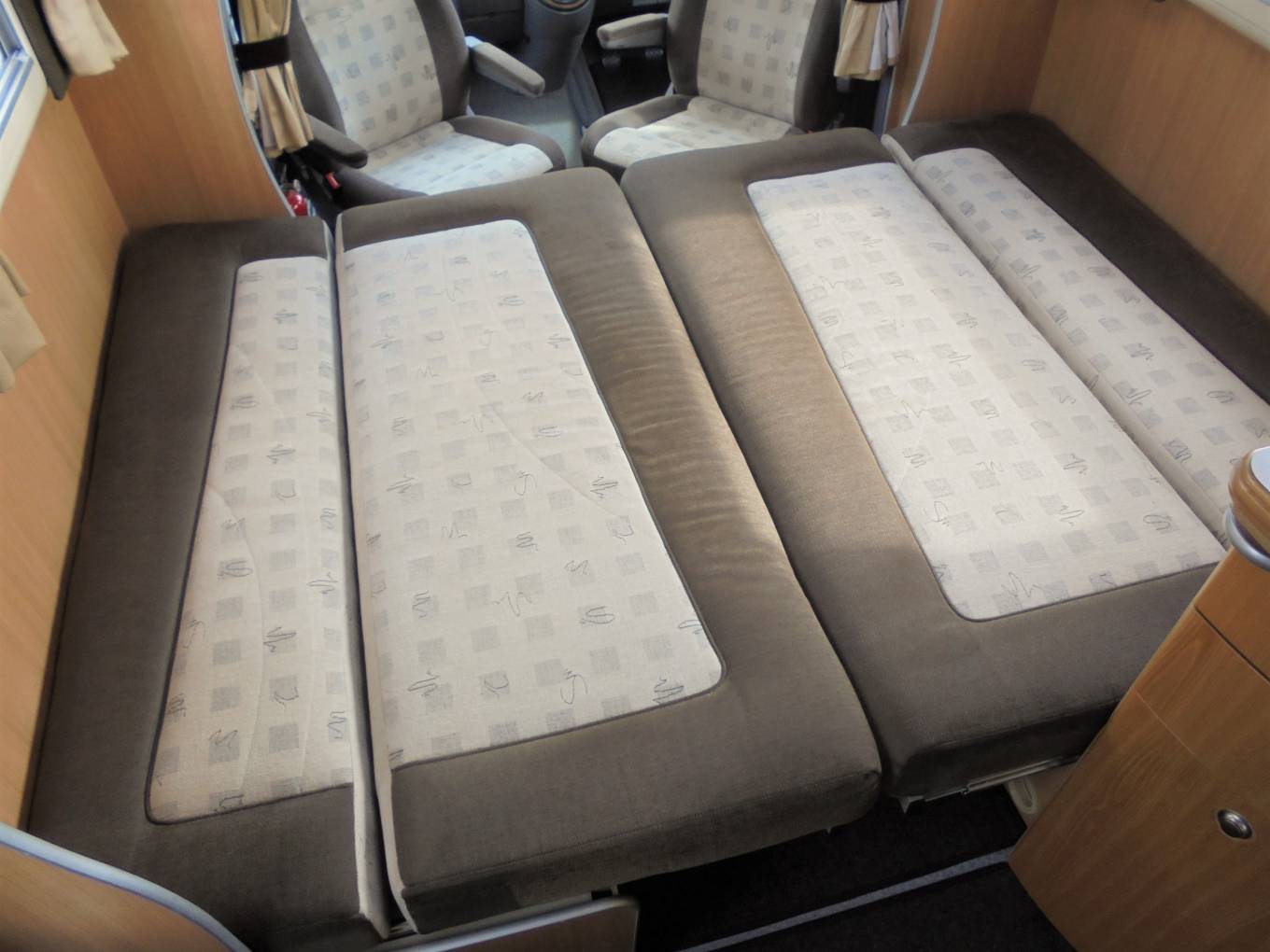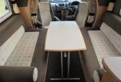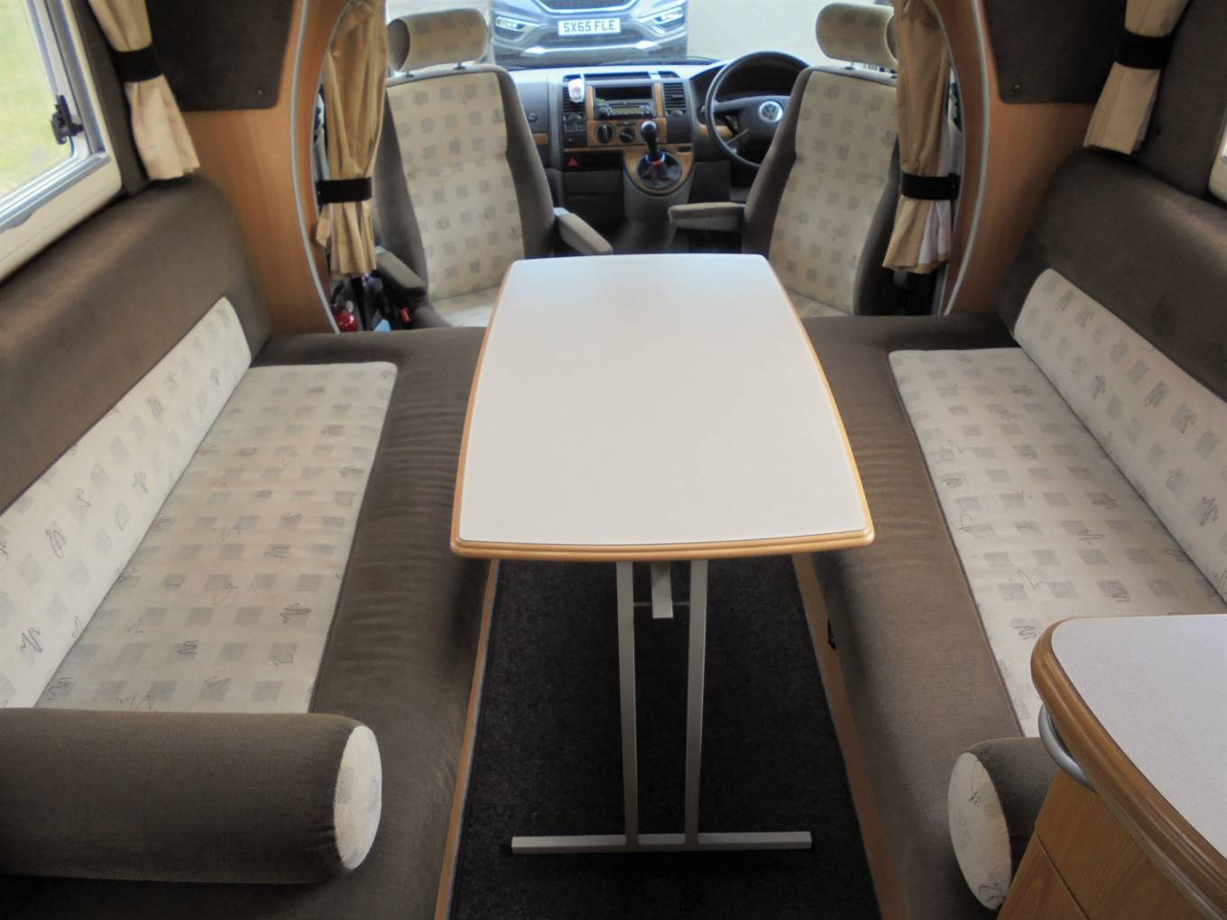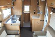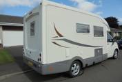 Kitchen area has ample worktop space, sink, hob with 3x gas and 1X electric rings, oven and grill, 3-way fridge with freezer compartment. Heating is provided via a diesel fed Truma system, hot water is also via a Truma system on gas or electric. Dining table for lounge. Washroom has cassette toilet, standalone shower cubicle, sink unit and wardrobe. This motorhome has a TV aerial, satellite dish, a TV DVD which fits to an existing bracket, rear speakers, loose fit carpets and window blinds throughout. Other features include swivel cab seats, reversing camera, lots of internal and external storage space.