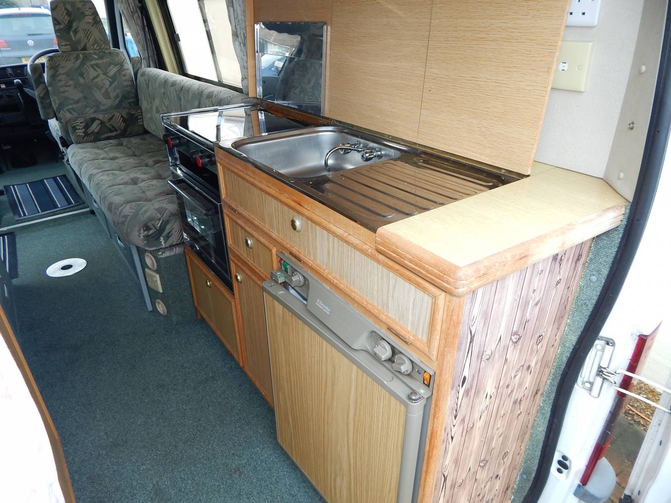 Kitchen to the rear drivers side of the camper consists; 2 burner gas hob, large oven and grill, chrome single sink & drainer with mixer tap & below a 3 way fridge with freezer compartment.