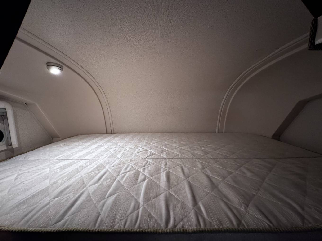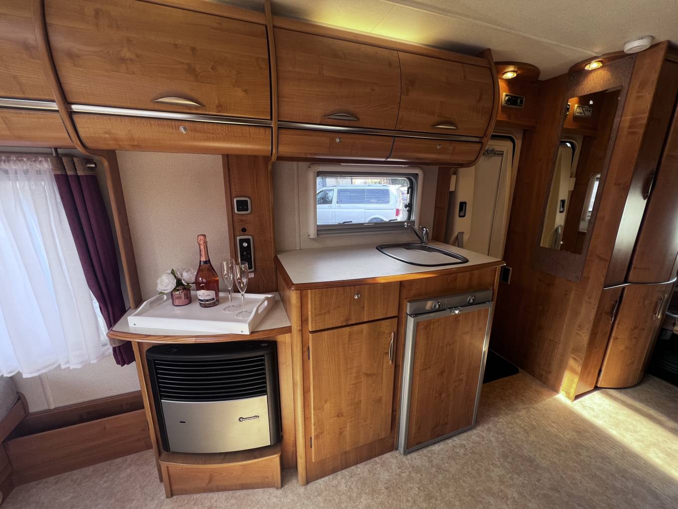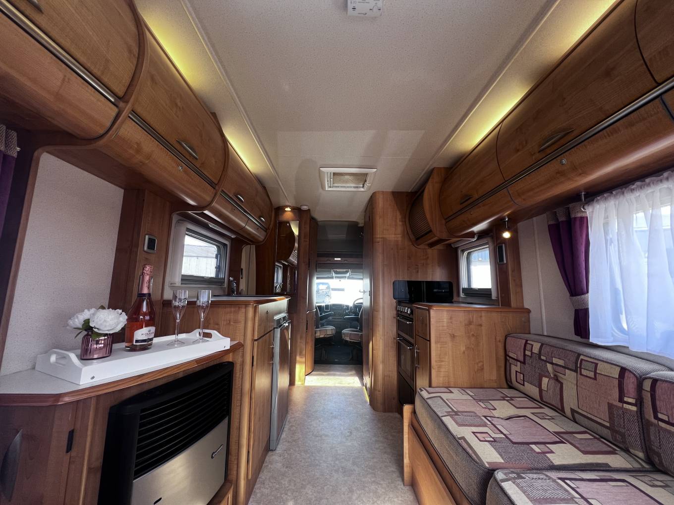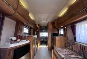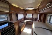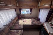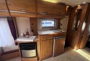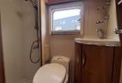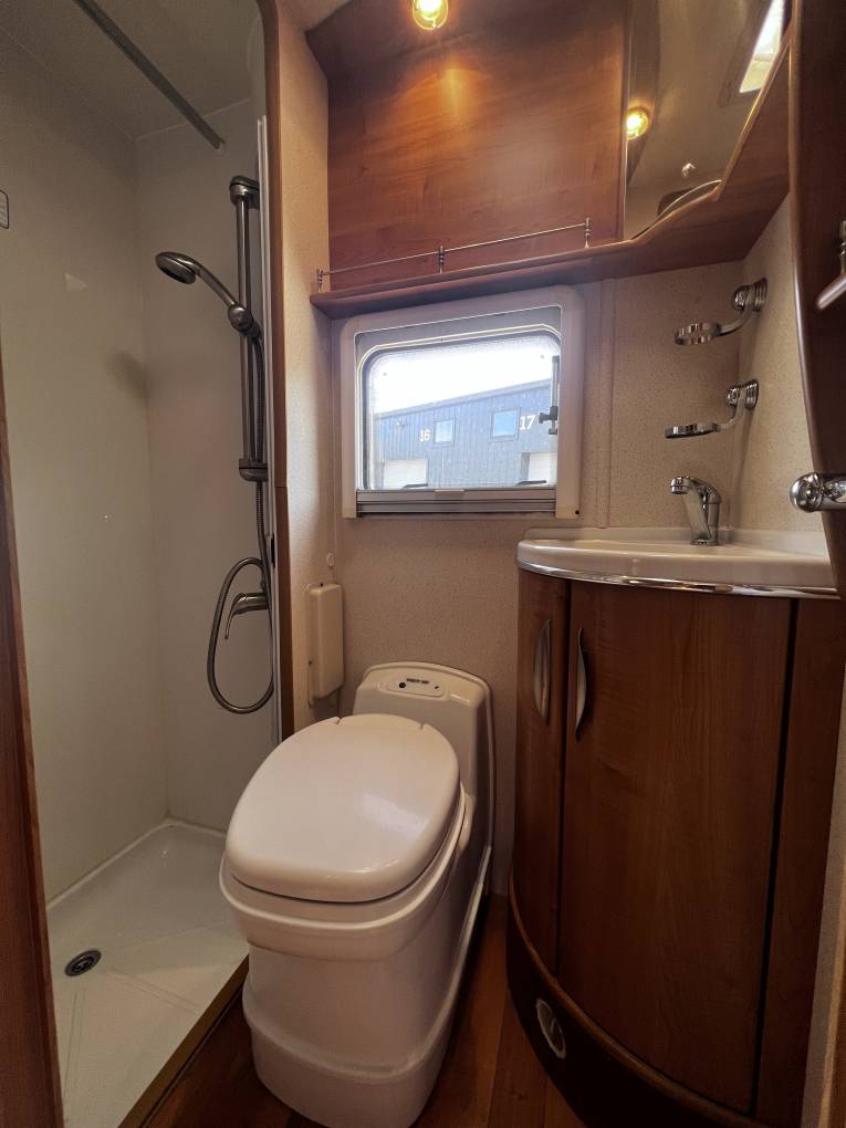 Forward of the kitchen is a large wardrobe opposite the well planned washroom which has the luxury of a separate shower. Both cab seats swivel and above the cab is a large double bed with ladder, which can double up as storage for bulky items.